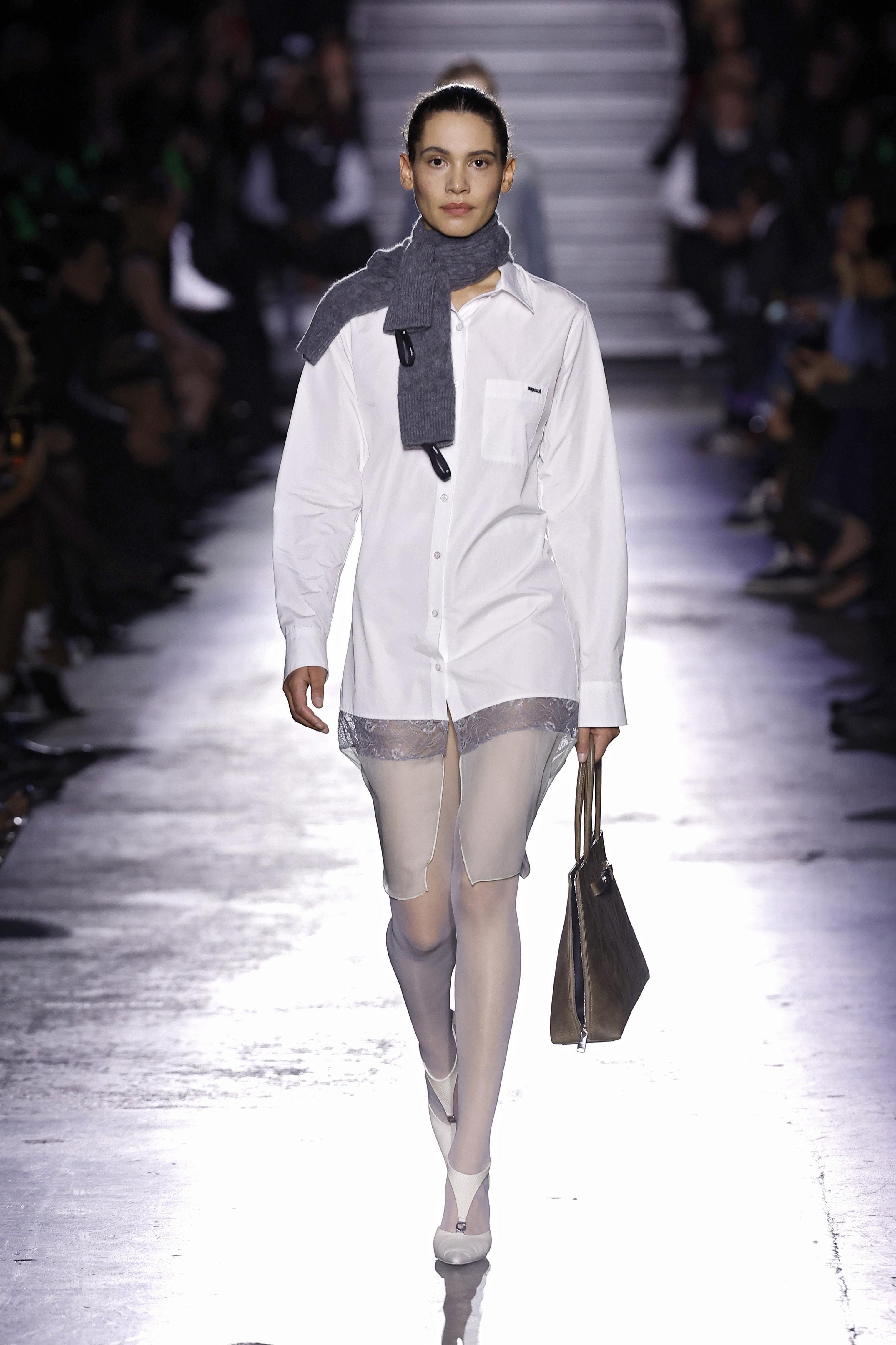 В коллекции Coperni белые колготки дополнили строгую белую оверсайз-рубашку и прозрачную юбку. Сдержанные линии рубашки, смелый акцент в виде юбки и театральность колготок создают выразительное противопоставление, играющее на контрастах и усиливающее драматизм всего образа.