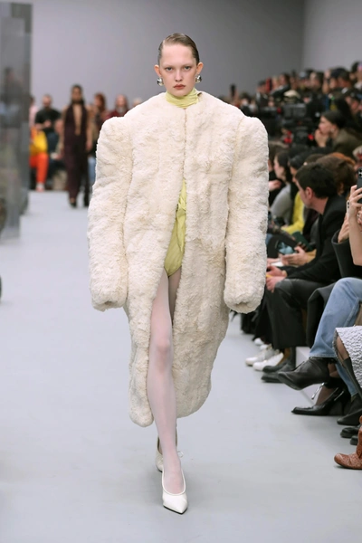 На подиумах сезона осень-зима 2025/26 белые колготки были в центре внимания. В Acne Studios, например, их сочетали с лимонным боди и объемной кремовой шубой — сочетание мягкости и силы создает эффектный контраст, который сразу привлекает внимание. Белый цвет здесь работает как фон, подчеркивая и яркость, и текстуру остальных элементов образа.