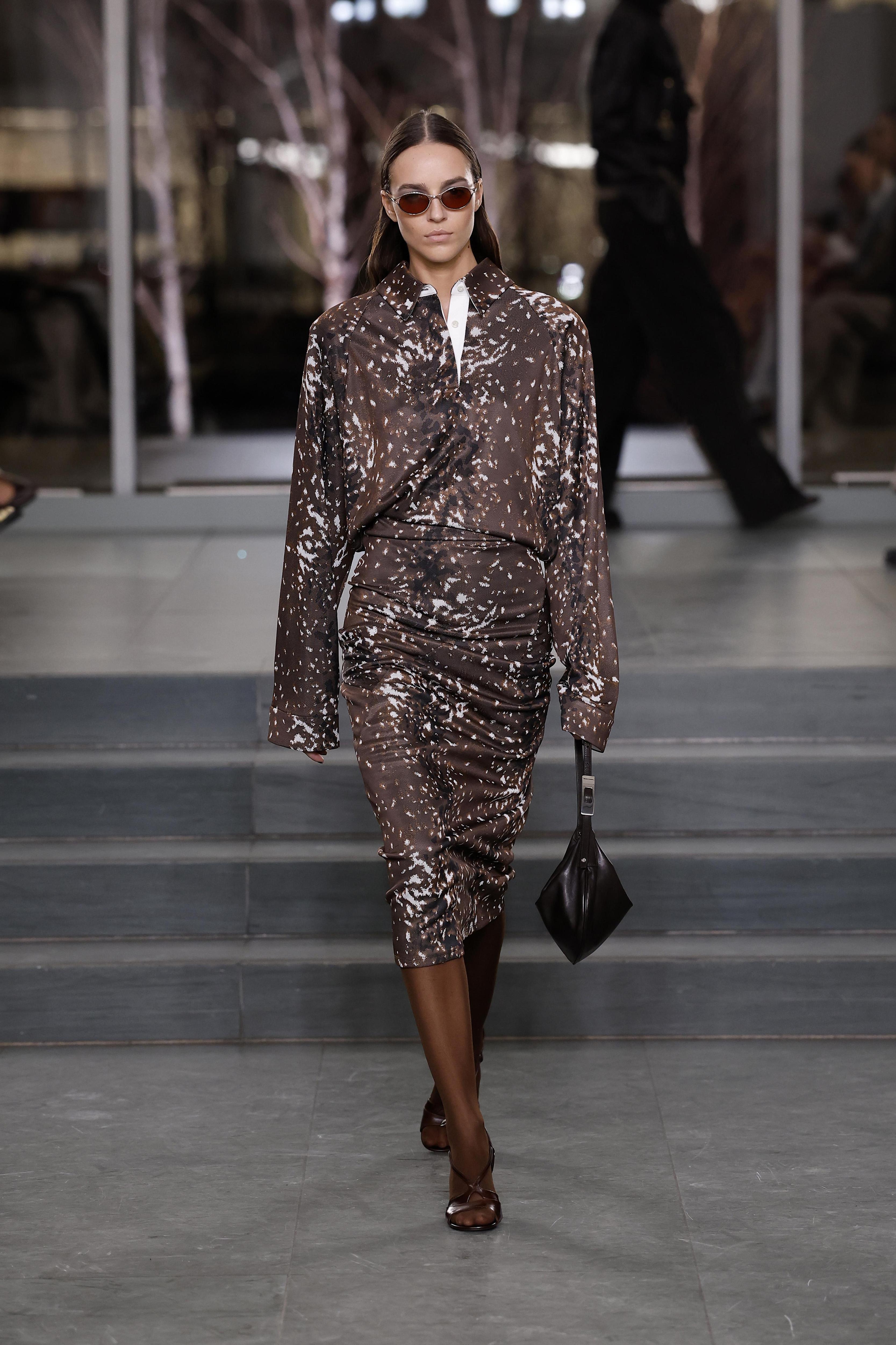В коллекции Тори Берч осень-зима 2025 принт «Бэмби» выглядит сдержанно, почти камуфляжно. Оттенки бежевого, мха и ореха образуют деликатный узор, который будто растворяется в ткани. Такие вещи хочется носить не только на подиуме — они органично вписываются и в городскую среду, и в выходной день за городом.