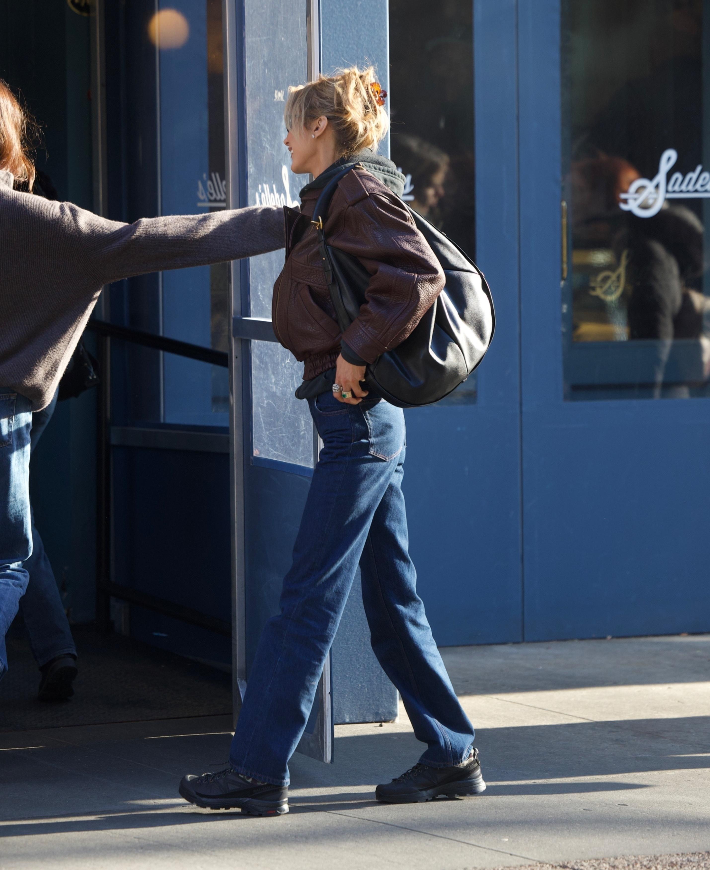 Обувь Белла выбрала максимально практичную — черные кроссовки для треккинга. Они добавляют образу утилитарности и подчеркивают, что перед нами не стилизация для съемки, а реальная городская одежда. Контрастом к ним выступает сумка: женственная, мягкая, вместительная хобо, небрежно закинутая на плечо. Именно такие аксессуары сейчас лучше всего работают с кожей и денимом, смягчая общее впечатление. А золотистая фурнитура на ней очень гармонично собирает весь образ, перекликаясь с медными клепками на куртке и многочисленными кольцами на руках модели.