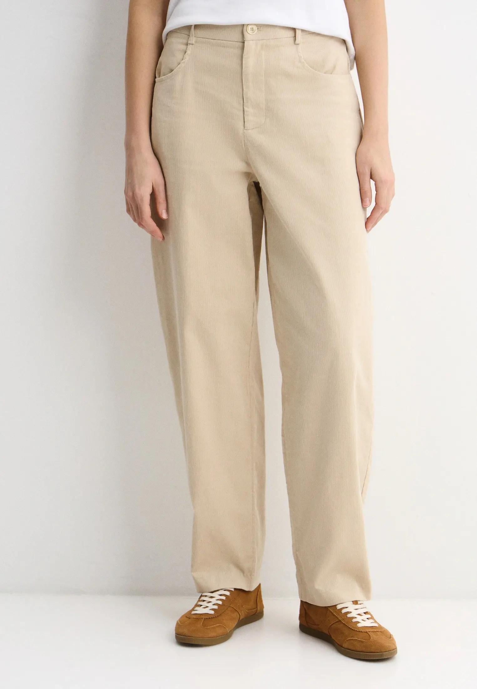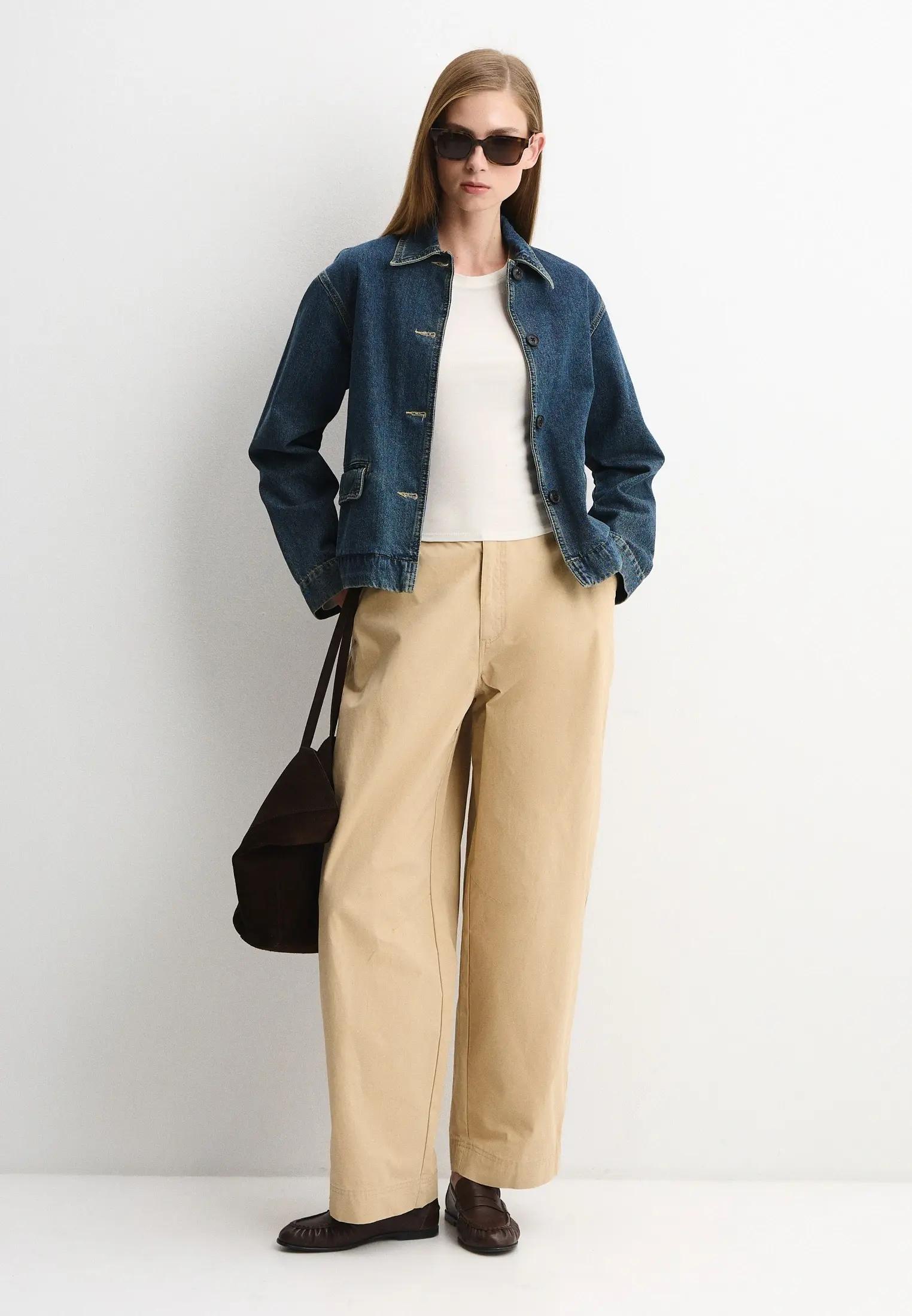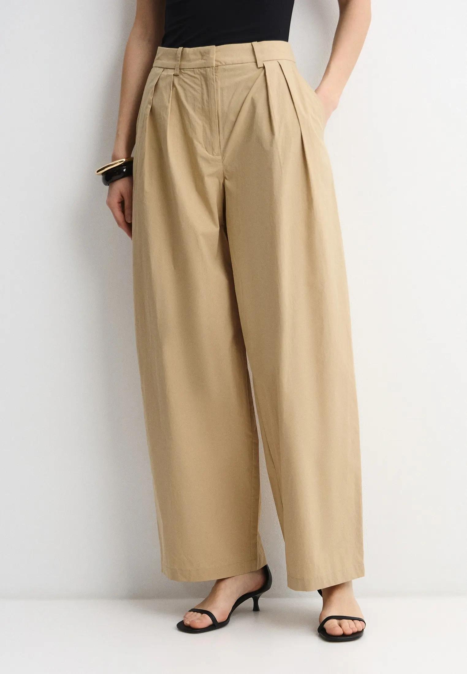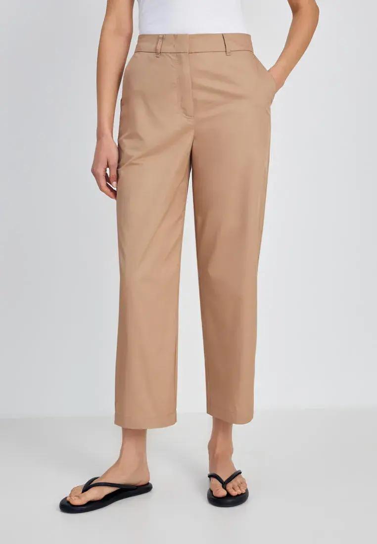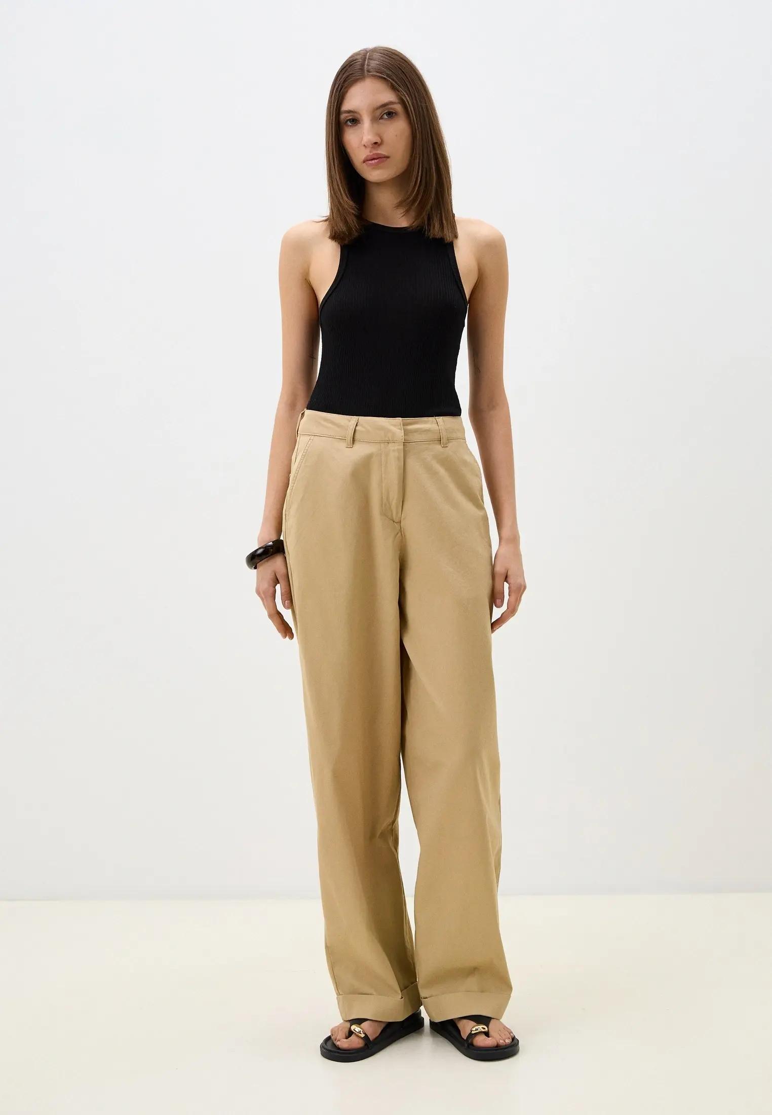 Для тех, кто ищет вариант на каждый день, брюки из плотного хлопка — настоящая находка. Они держат форму, не блестят (что порой удешевляет бежевый цвет), не мнутся так сильно, как лен, и выглядят очень структурированно. Такие брюки можно смело носить в офис, на прогулку и на встречу с подругами.
