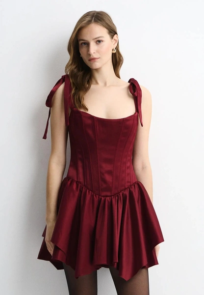 Что особенно удобно — подобный образ легко адаптировать под реальную жизнь. Если заменить сценическое мини на аккуратное винное платье, оставить акцент на корсетной линии, но убрать лишние декоративные элементы, получится отличный вариант для новогодней вечеринки, ужина или празднования в кругу друзей. А если наоборот хочется добавить драмы, то элементы вроде тканевых роз, объемных сборок и многослойной юбки будут как раз кстати.