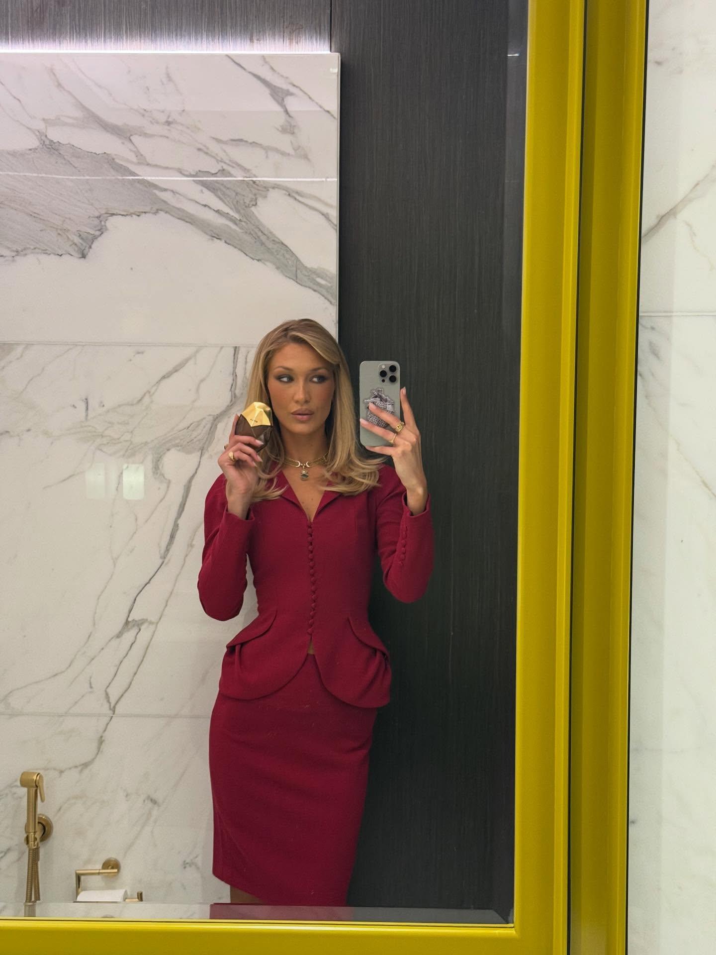 Белла Хадид умеет превращать любое свое появление в событие. Даже если речь идет не о красной дорожке, а о семейном ужине. В минувшие выходные супермодель отметила сразу два повода — день рождения родного человека и запуск собственного парфюмерного бренда Orebella на Ближнем Востоке. Для этого события Белла выбрала наряд, в котором соединились женственность, сдержанная роскошь и верность классике — бордовый костюм с баской и юбкой-карандаш.