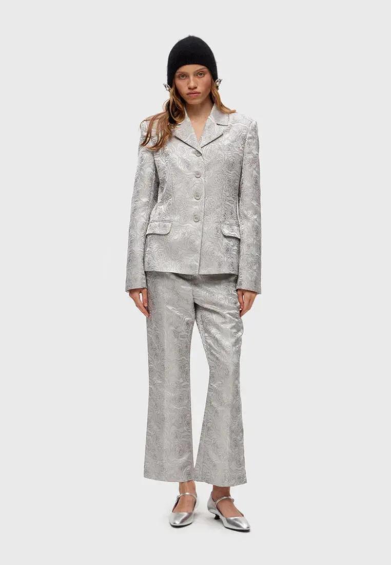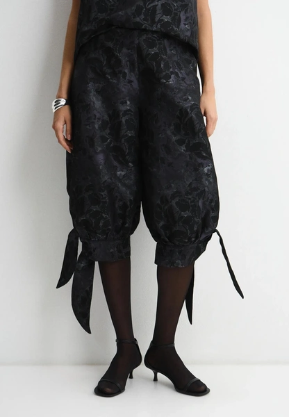 Пожалуй, самый смелый вариант — жаккардовые брюки или бриджи. Они сразу задают ретро-настроение и делают образ запоминающимся. Лучше сочетать их с максимально простым верхом: однотонной водолазкой, рубашкой или лаконичным жакетом. Так акцент останется именно на ткани, а образ будет выглядеть гармонично.