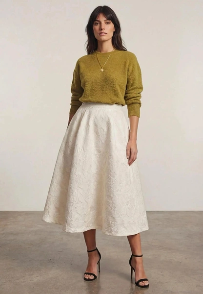 Жаккардовые юбки особенно хороши тем, что отлично держат форму. Они подчеркивают силуэт и выглядят аккуратно даже без сложной стилизации. Сочетай такую юбку с уютным джемпером, свитером или укороченным жакетом. Контраст нарядной ткани и расслабленного верха делает образ современным и небанальным.
