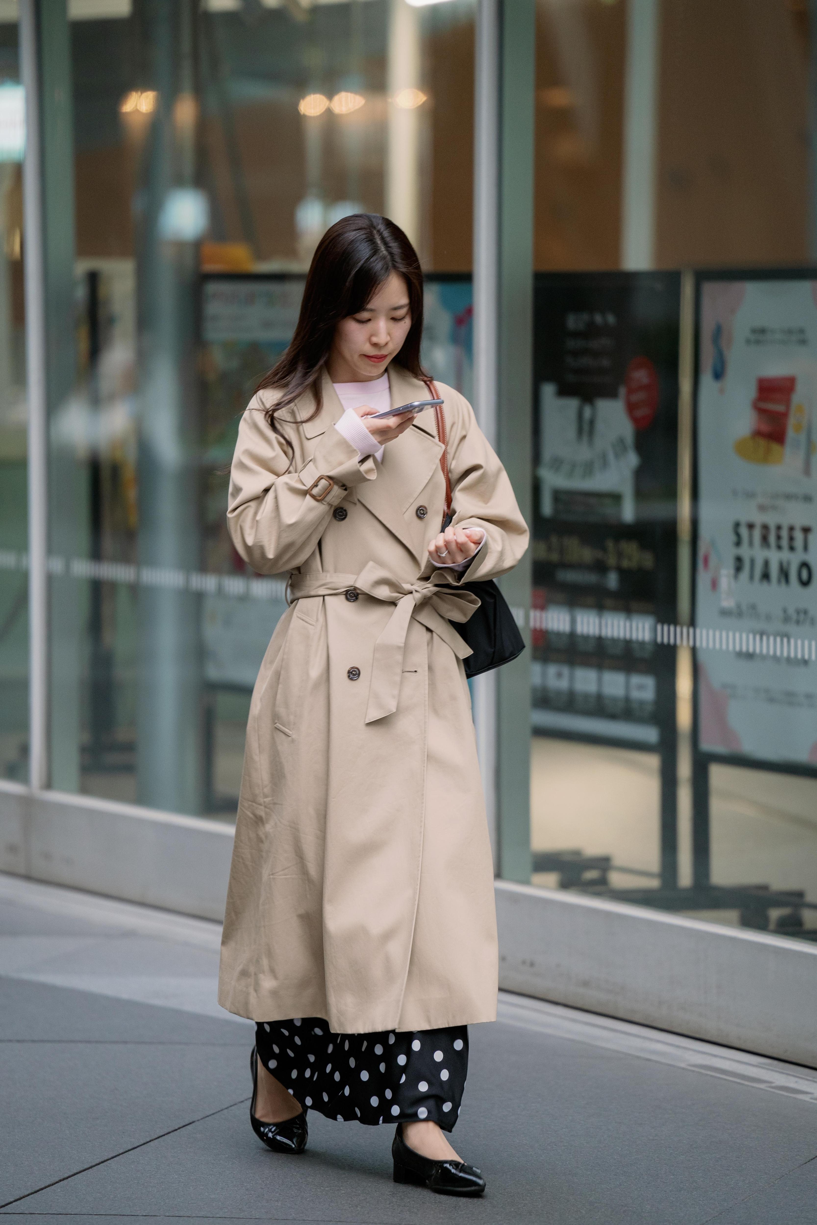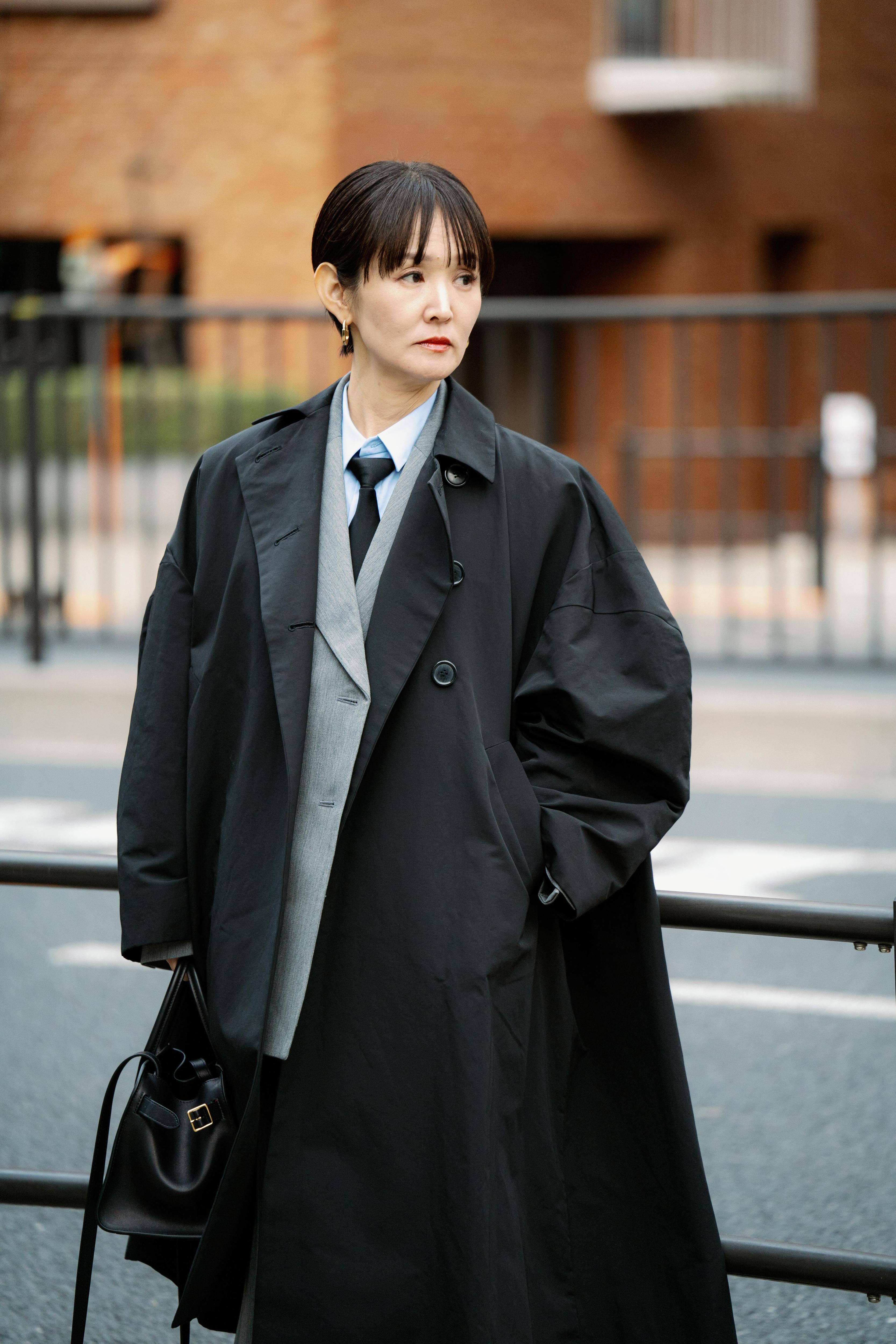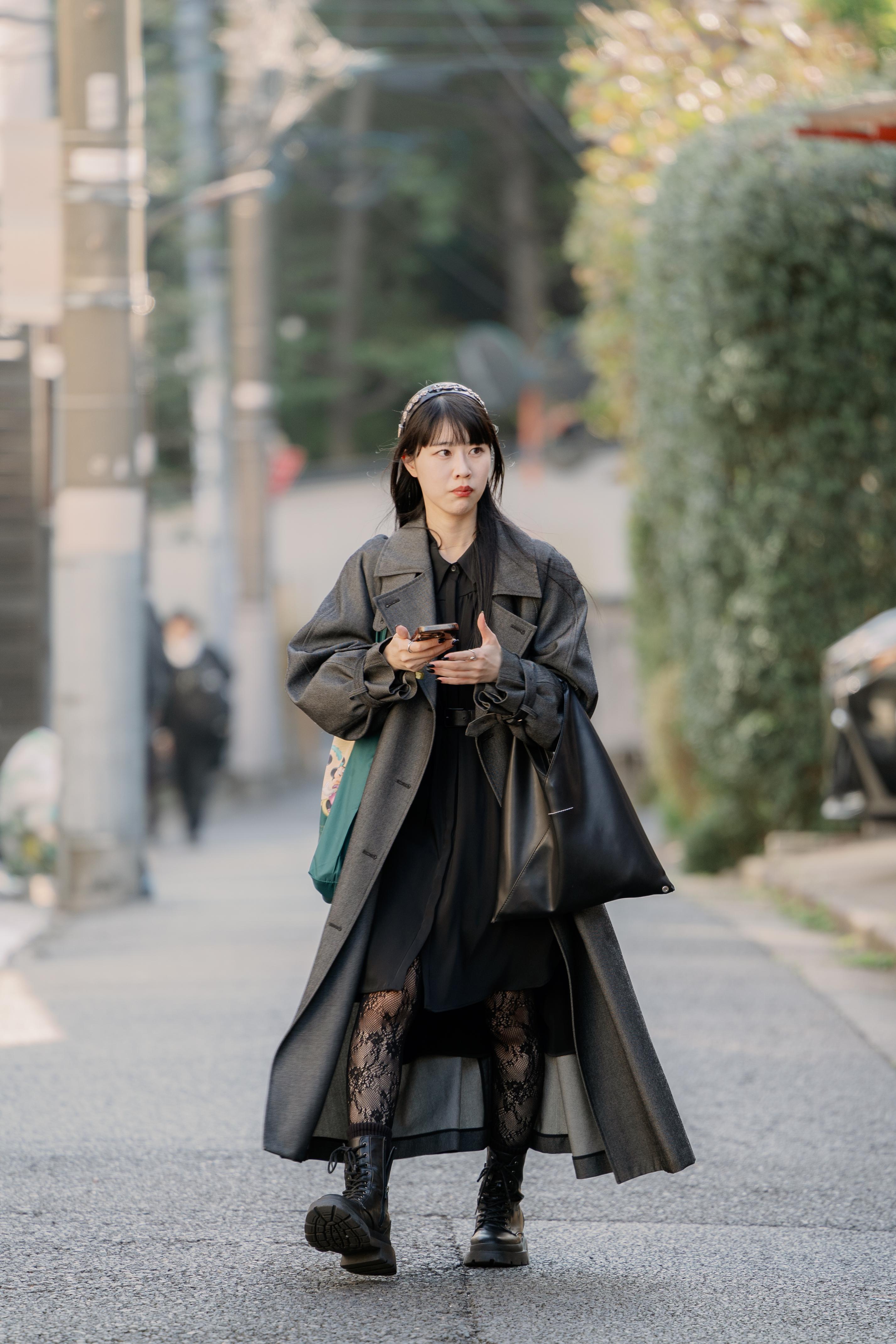 Тренд, который возвращался несколько сезонов подряд и наконец закрепился окончательно. Черные сетчатые колготки с рисунком — снова маст-хэв! В Токио их носили с короткими юбками, но с обязательным условием: верхняя одежда должна быть длинной. Из-под объемного пальто или плаща выглядывает лишь край юбки и ажурные ноги — интригующий прием, который удлиняет силуэт и добавляет образу слоистости.