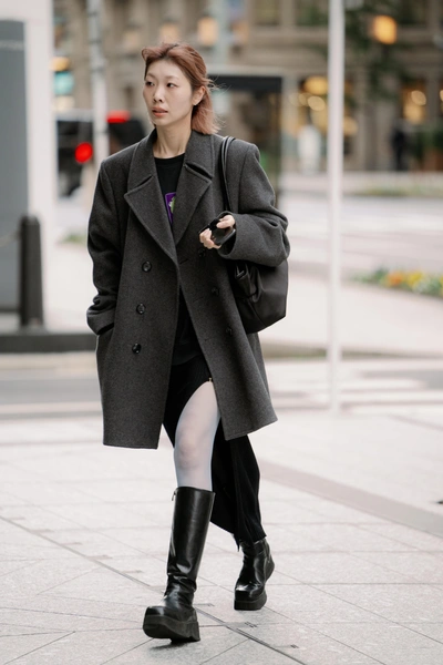 Обувь на массивной подошве никуда не уходит, просто меняет форму. В этом сезоне в Токио правят сапоги на платформе. Интересно, что носят их не с мини и не с вызывающими вещами, а наоборот — со спокойной классикой. Длинные строгие пальто, простые юбки, минималистичные костюмы. Контраст между тяжелой обувью и элегантным верхом создает аккуратную динамику, которая завораживает куда больше броской агрессии.