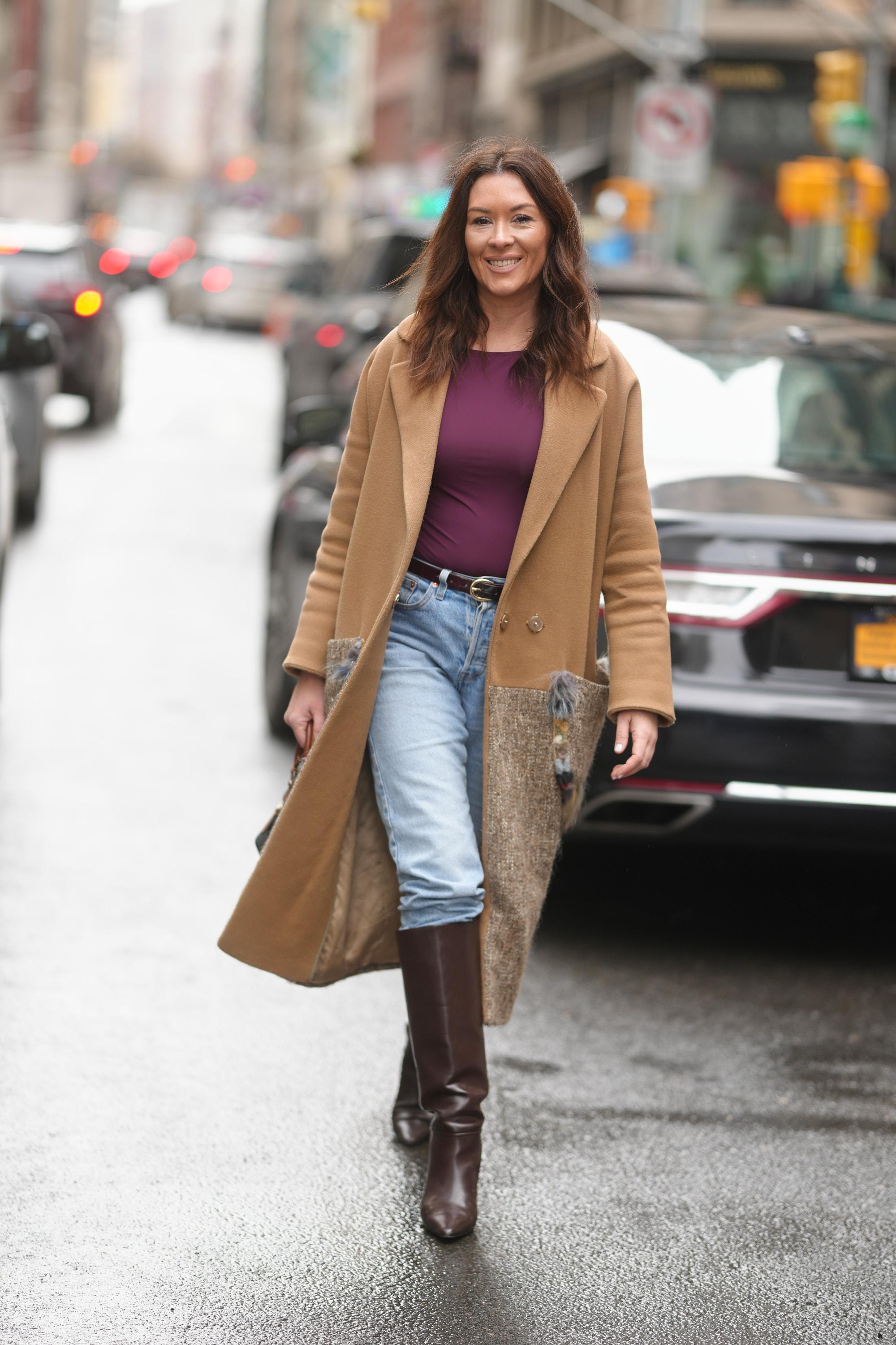 Что может выглядеть эффектнее, чем классические голубые или синие джинсы, заправленные в высокие коричневые кожаные сапоги? Пожалуй, ничего. На улицах Нью-Йорка этот прием встречался на каждом шагу. Сапоги предпочитали разные — и на каблуке, и на плоской подошве, а верх обязательно выбирали свободный: это могло быть объемное пальто или пиджак оверсайз, с которым луки моментально напоминали о культовом образе принцессы Дианы с большим пиджаком и джинсами, заправленными в казаки 😍