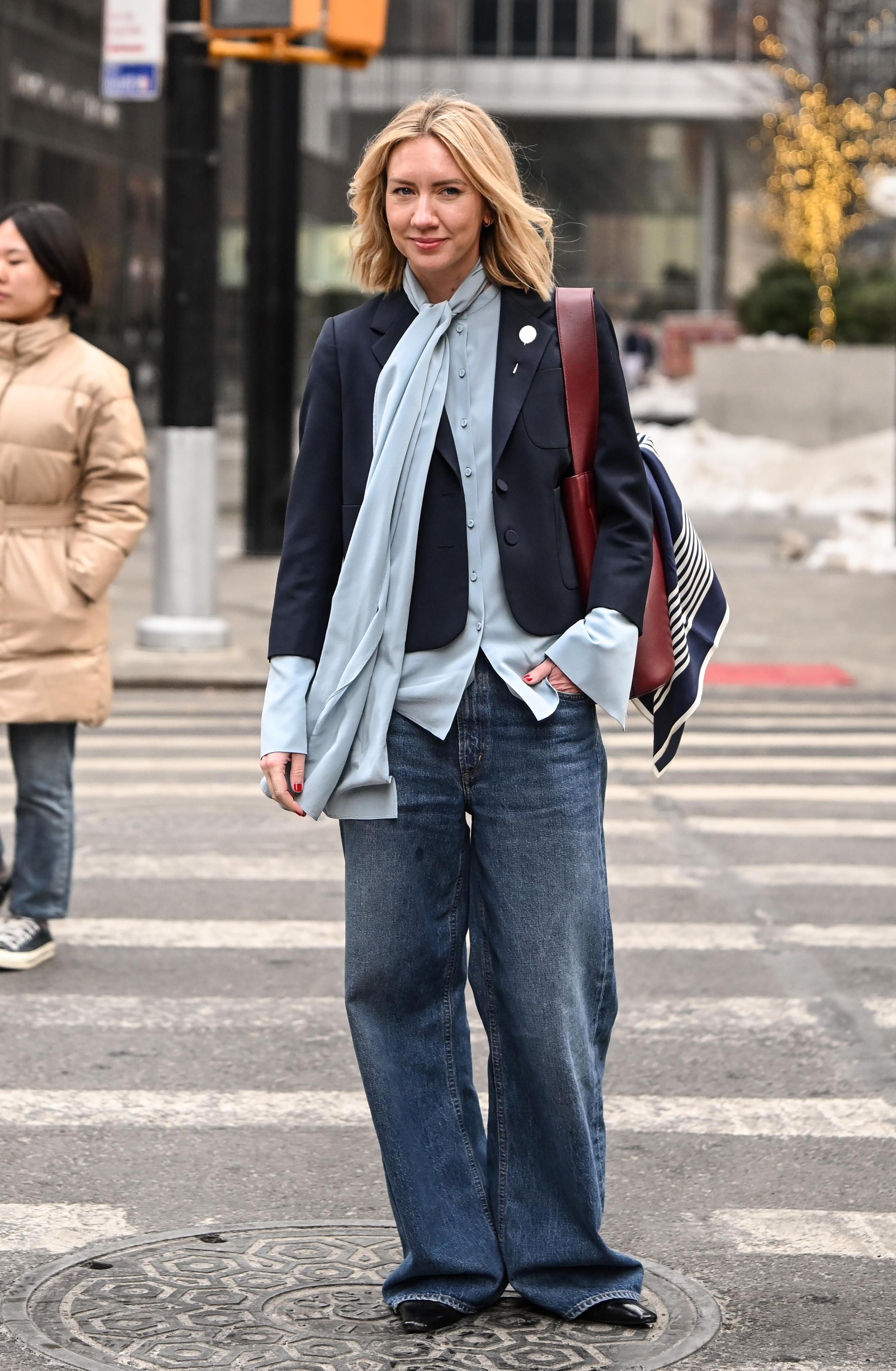 Воздушные блузы с длинными воротниками-лавальерами стали одним из самых притягательных трендов, который можно было углядеть на нью-йоркских улочках. Но важная деталь: их не завязывали по обыкновению в банты. Самые модные гости оставляли длинные концы развеваться на ветру, превращая воротник в подобие шарфа, который создавал движение при каждом шаге. Особенно эффектно этот прием смотрелся в паре с утилитарными вещами — простыми джинсами и структурными жакетами. Контраст нежной, почти бельевой блузы и грубоватых повседневных тканей работал безотказно.