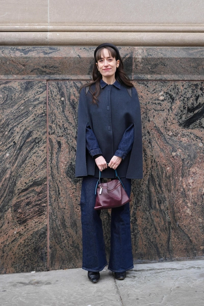 Пальто без выраженных рукавов, напоминающее скорее роскошный плед с прорезями для рук, стало настоящей визитной карточкой модных гостей Нью-Йорка. И здесь важный нюанс: обладательницы кейпов не пытались усложнять образы. Они выстраивали самые простые, даже нарочито обыденные комбинации, зная, что само пальто уже выглядит необычно и заметно.