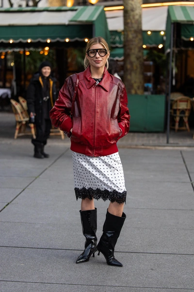 Контраст — один из главных инструментов французского стиля, и этой зимой он особенно заметен. Кожаные куртки, объемные пальто, бомберы и тяжелые жакеты сочетали с шелковыми юбками-слип, кружевными фактурами и мягкими тканями. Такой прием создает напряжение внутри образа и делает его интересным с первого взгляда. На ногах — чаще всего кожаные сапоги или строгая обувь, чтобы сохранить баланс и не уйти в театральность.