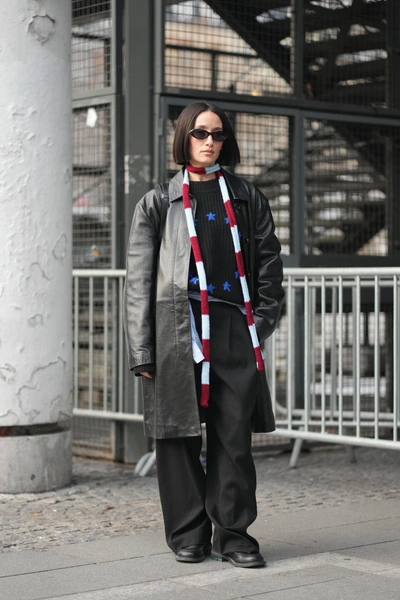 Узкие шарфы — привет из нулевых, который окончательно закрепился в гардеробах модников. В Париже их носили не ради тепла, а как акцент. Яркие, контрастные или, наоборот, приглушенные, они легко вписывались в образы с пальто, кожаными куртками и даже костюмами. Шарф не завязывали сложными узлами — чаще всего просто накидывали на шею или делали один свободный оборот. Такой аксессуар работает как визуальная точка, собирая образ и добавляя ему характера без перегруза.