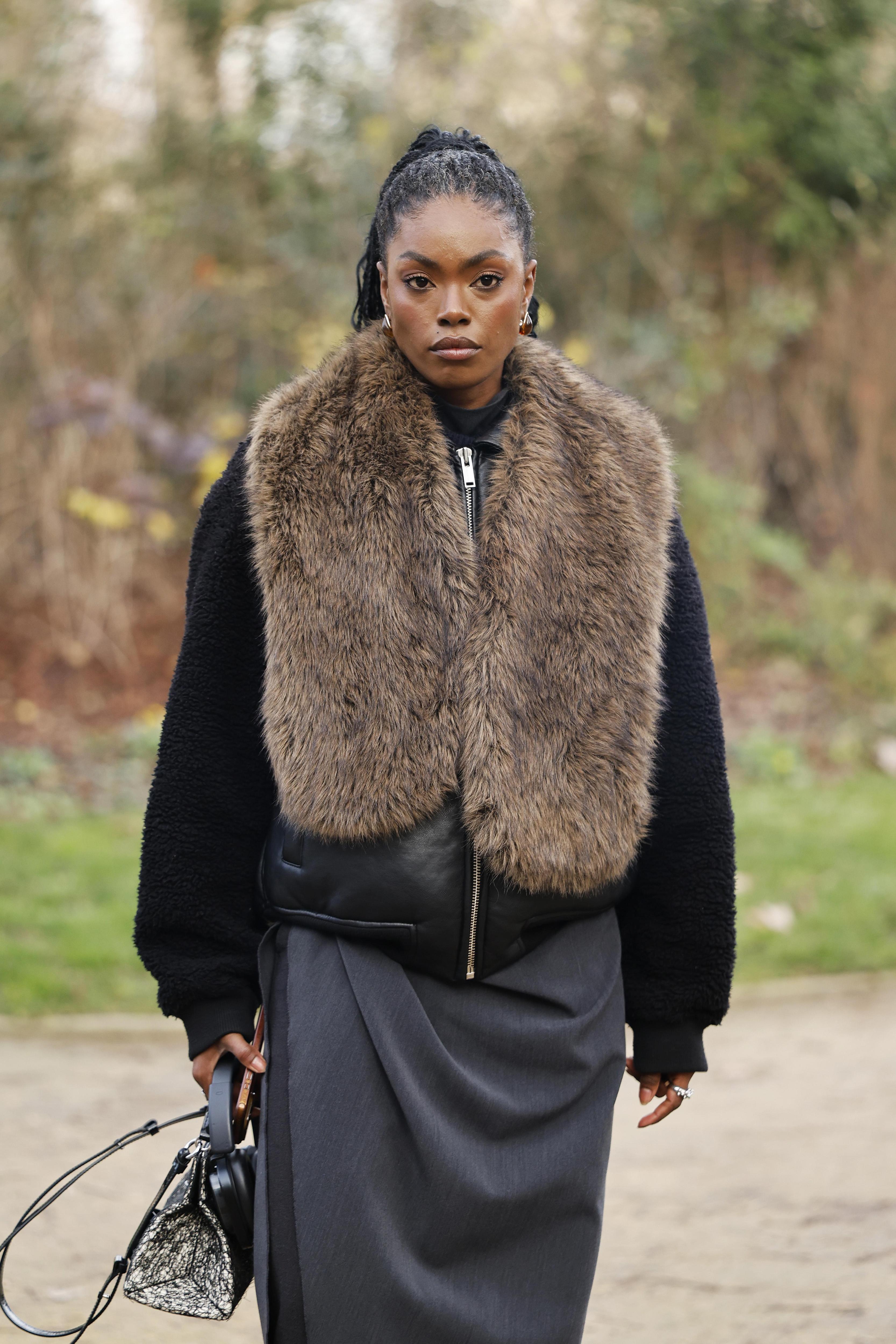 Меховые шарфы натуральных оттенков — бежевые, коричневые, серые — спокойно лежали на плечах, не перетягивая на себя внимание. Их носили с пальто прямого кроя, кожаными куртками и даже с пиджаками. Такой аксессуар добавляет образу глубины и текстуры, при этом не выглядит нарочито нарядно.
