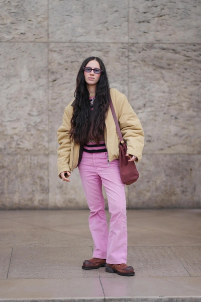 Пожалуй, один из самых заметных уличных сигналов этой недели — розовый низ. Брюки и джинсы в пудровых, холодных или насыщенных розовых оттенках встречались неожиданно часто. Их сочетали с серыми пальто, черными и бежевыми куртками, простыми джемперами и строгими жакетами. За счет спокойного верха цвет не выглядел вызывающе, а наоборот — освежал образ и делал его современным.