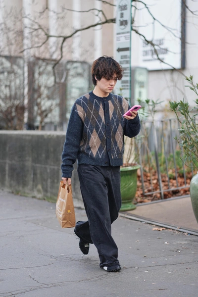 Трикотаж с ромбами уверенно закрепился в мужском и женском стритстайле. Джемперы и кардиганы с узором аргайл носили поверх рубашек, с пальто или соло. Цветовые сочетания варьировались от классических до неожиданных, но сам прием всегда работал на ощущение уюта и интеллигентности.