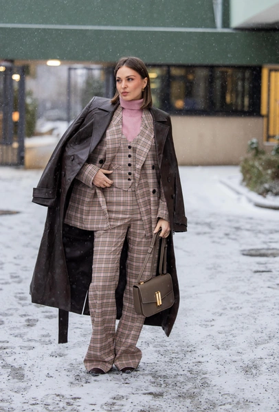 Клетчатые костюмы стали одним из самых заметных повторяющихся мотивов недели. Их носили не строго и не офисно: пиджаки брали на размер больше, брюки — с мягкой посадкой, под низ надевали водолазки или тонкие свитеры. Особенно популярной оказалась крупная клетка в тепло-коричневой гамме, которая идеально вписывается в зимний городской пейзаж. Такой костюм легко адаптируется под повседневную жизнь — именно поэтому он так органично смотрится на улице.