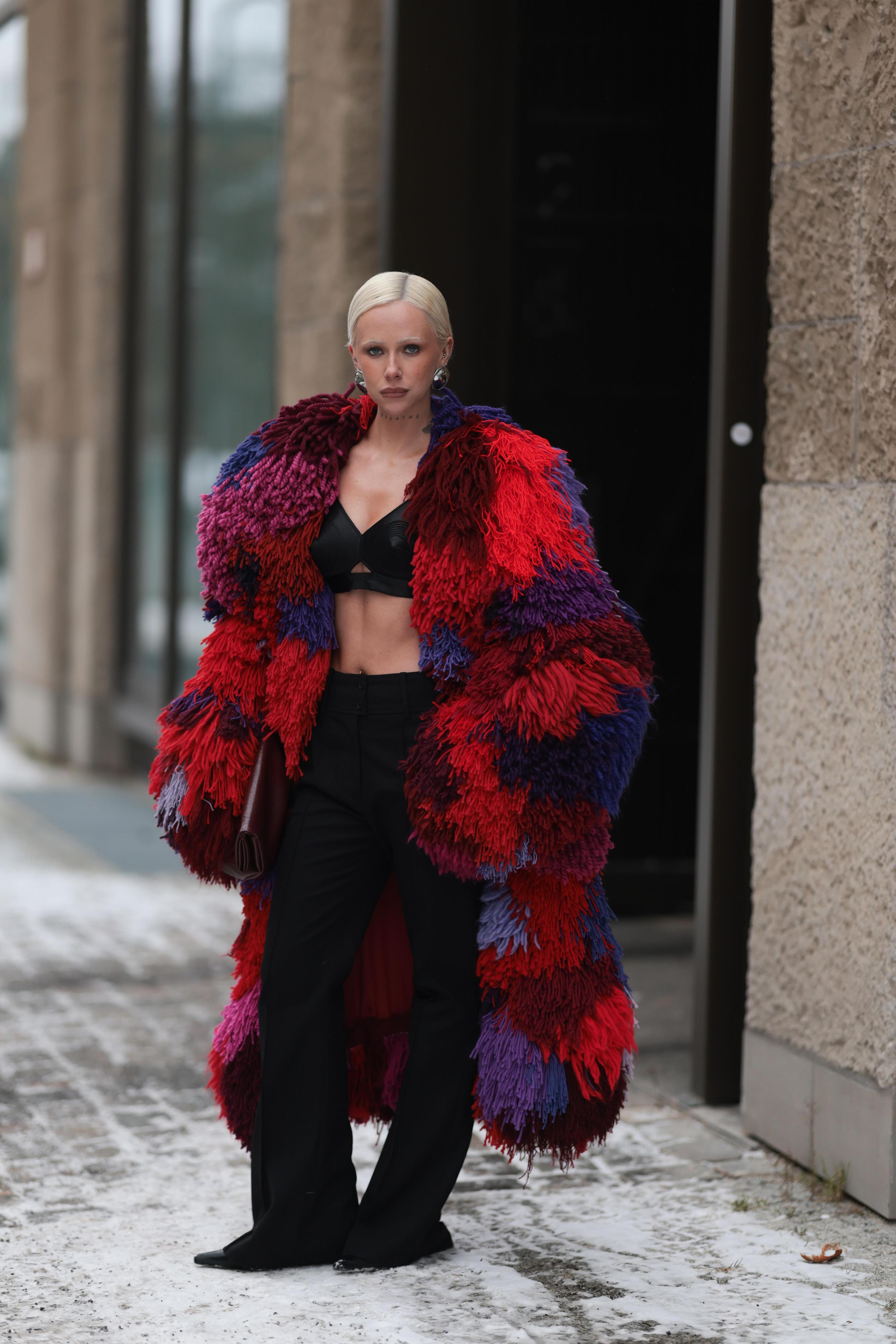 Берлин этой зимой выбрал цвет. На фоне серых заснеженных улиц особенно эффектно смотрелись насыщенные шубы — алые, травянисто-зеленые, кобальтовые, разноцветные. Причем речь не о глянцевой роскоши, а о нарочито массивных, почти утилитарных моделях. Их носили с простыми джинсами, грубыми ботинками, объемными шарфами, не стараясь «уравновесить» яркость. Шуба здесь работает как самостоятельное высказывание: один предмет — и весь образ собран.