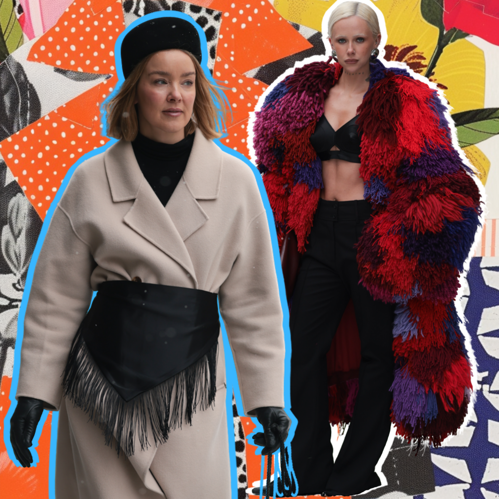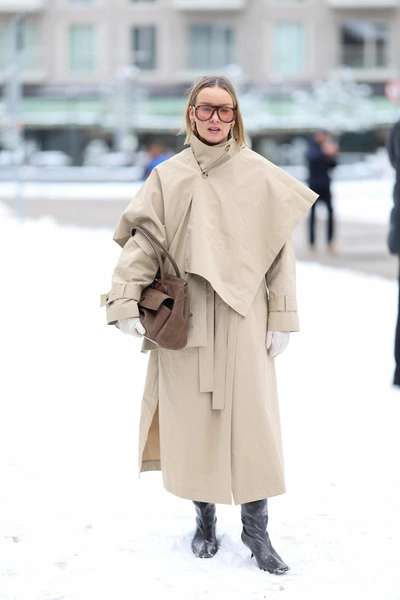 Берлинский стритстайл продолжает играть с формой. Тонкие шерстяные, плотные драповые или идущие в комплекте из той же ткани накидки набрасывали на плечи поверх курток, классических пальто и плащей, создавая эффект дополнительного слоя. Это выглядело и слегка театрально, и очень функционально — идеальный вариант для холодной ветреной погоды. Чаще всего кейпы были однотонными, спокойных оттенков, чтобы не спорить с остальными элементами образа.