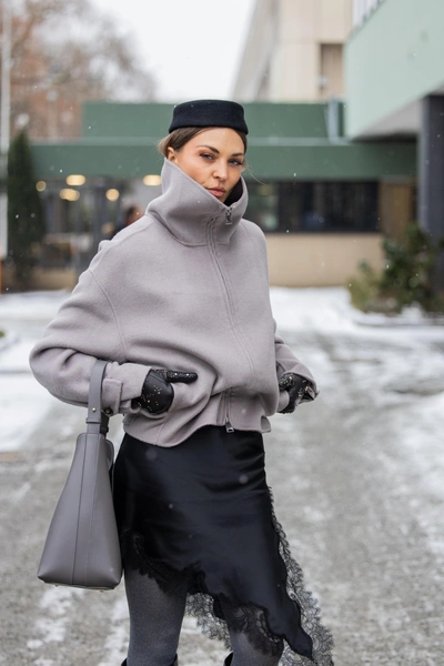 Пальто и куртки с воротником-стойкой стали почти обязательным элементом зимнего гардероба на Неделе моды в Берлине. Их выбирали за практичность и чистоту линии: высокий воротник закрывает шею, не требует шарфа и делает силуэт собранным. Особенно эффектно смотрелись модели из плотной шерсти или технических тканей, где воротник держал форму и задавал архитектуру всего образа.
