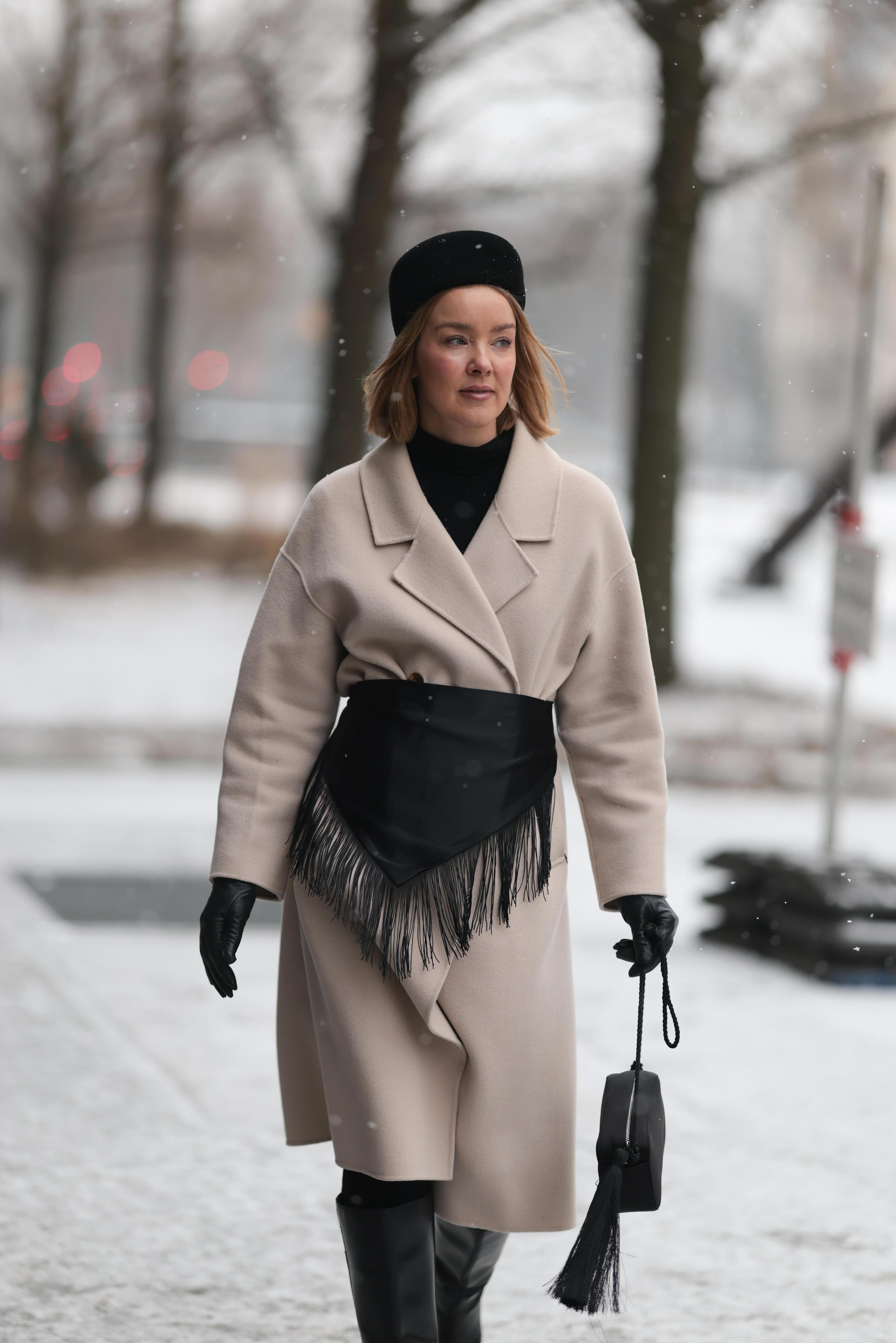 Один из самых любопытных приемов недели — палантин, завязанный поверх пальто на талии. Его небрежно скручивали, завязывали узлом или просто аккуратно фиксировали. Этот прием сразу решает несколько задач: добавляет структуры, создает цветовой акцент и делает даже самое простое пальто визуально сложнее.