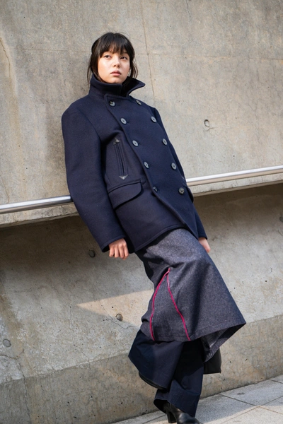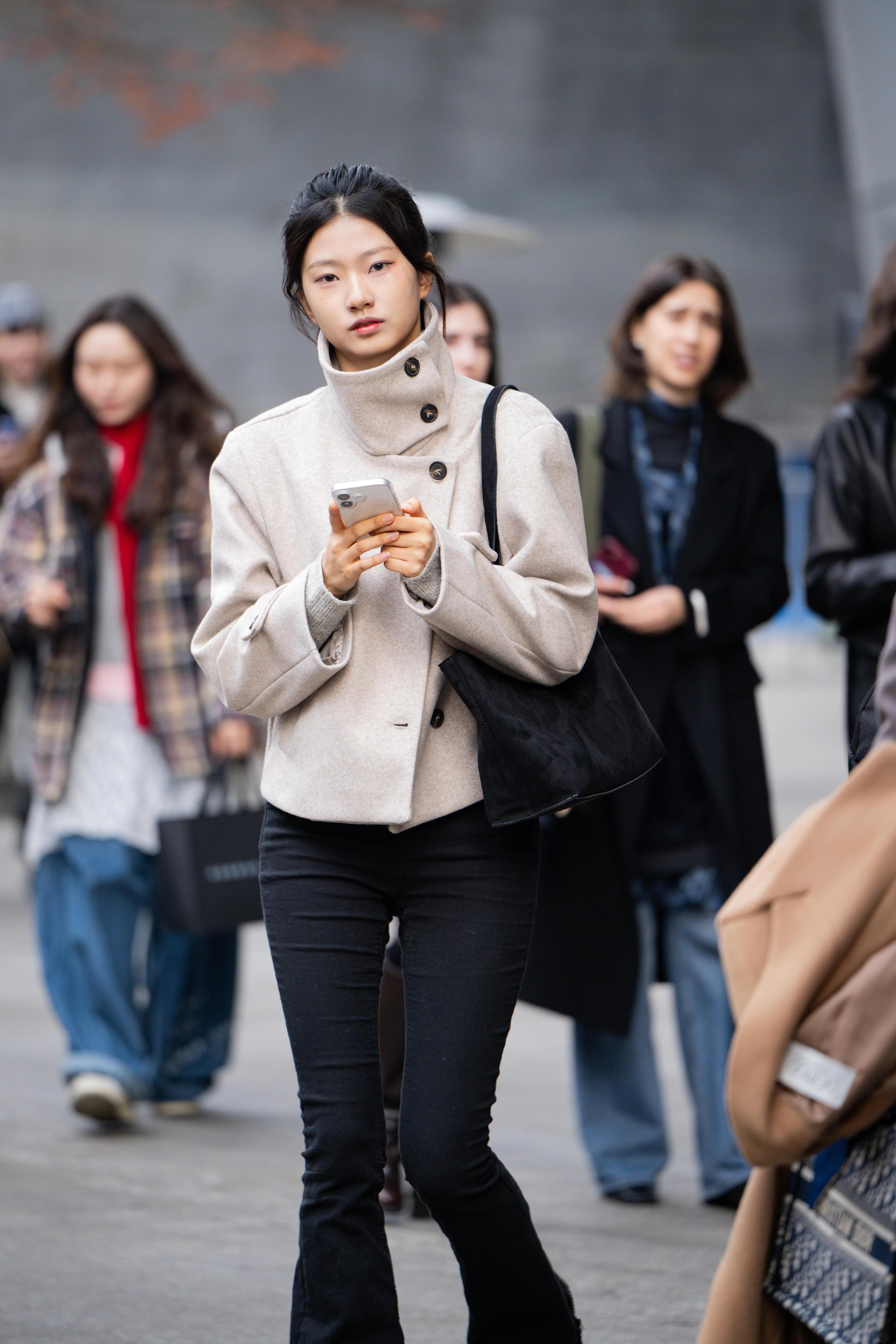 Некоторые вещи не подвластны времени и географии. Воротник-стойка, или «воротник-труба», — как раз из этой истории. Его носят и в Европе, и в Америке, но в Азии, и особенно в Корее, он обрел свое идеальное воплощение. На улицах Сеула можно увидеть его во всех вариантах: на длинных шерстяных пальто, на укороченных кожаных куртках, на объемных бушлатах. Его прелесть — в универсальности и скульптурности. Он красиво обрамляет лицо, добавляет образу графичности и элегантной строгости. Сочетают такое пальто часто с простой базой: черными брюками, грубыми ботинками и минимумом украшений, позволяя силуэту и фактуре говорить самим за себя.