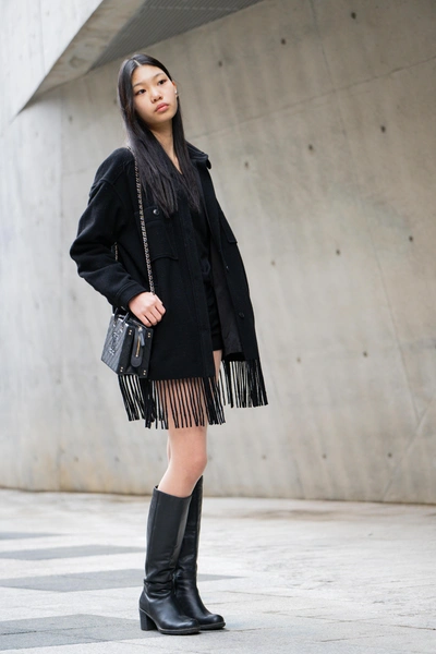 Бахрома переживает новый пик популярности, и в Сеуле это особенно заметно. Но если раньше она ассоциировалась с ковбойской эстетикой, то теперь ее используют как тактильный, динамичный акцент на верхней одежде. Длинная бахрома украшает подолы кожаных курток, края жакетов и даже рукава. Она добавляет движению легкости и создает красивый эффект при каждом движении. Ищи куртки или жакеты с таким декором — они станут твоей лучшей инвестицией в стильный гардероб.