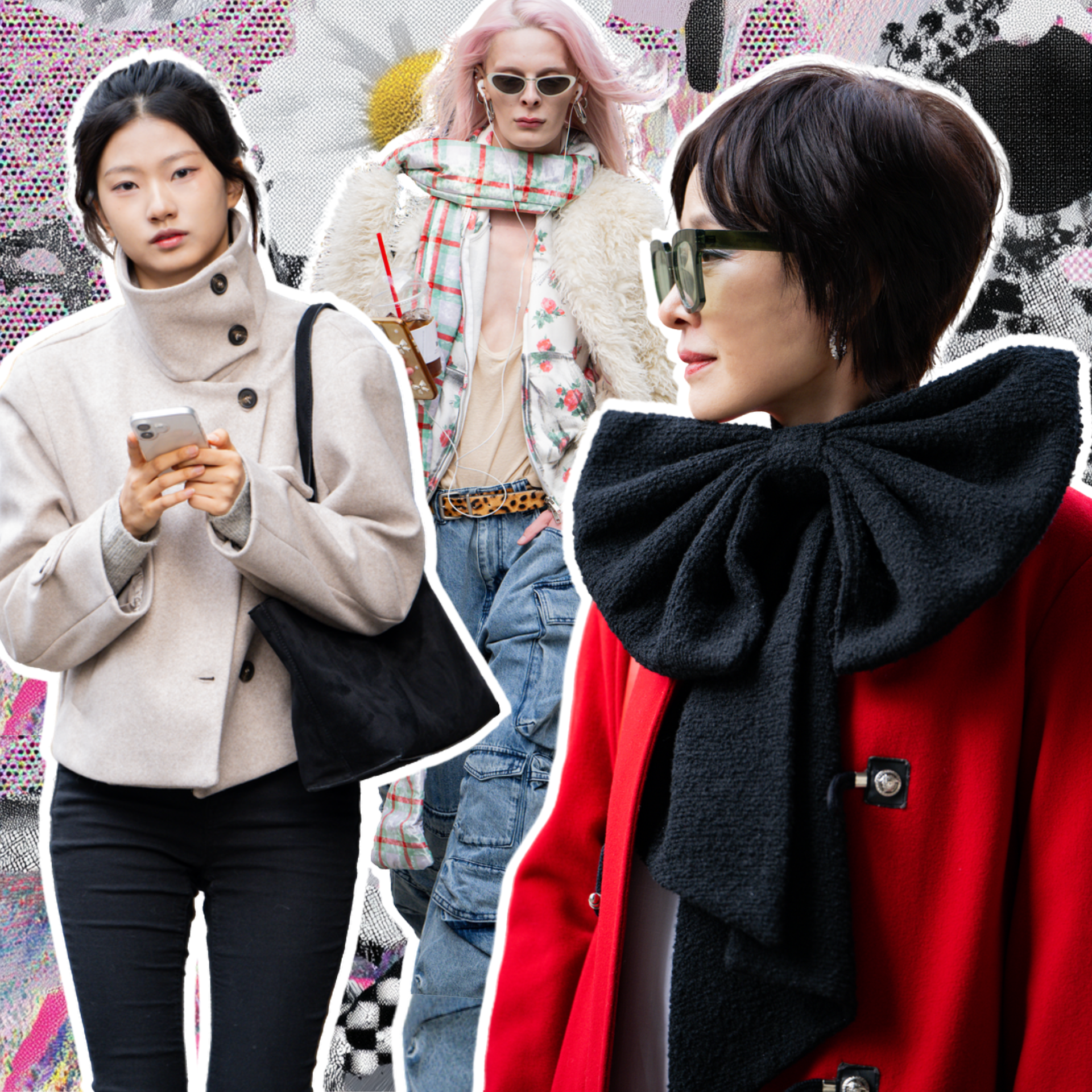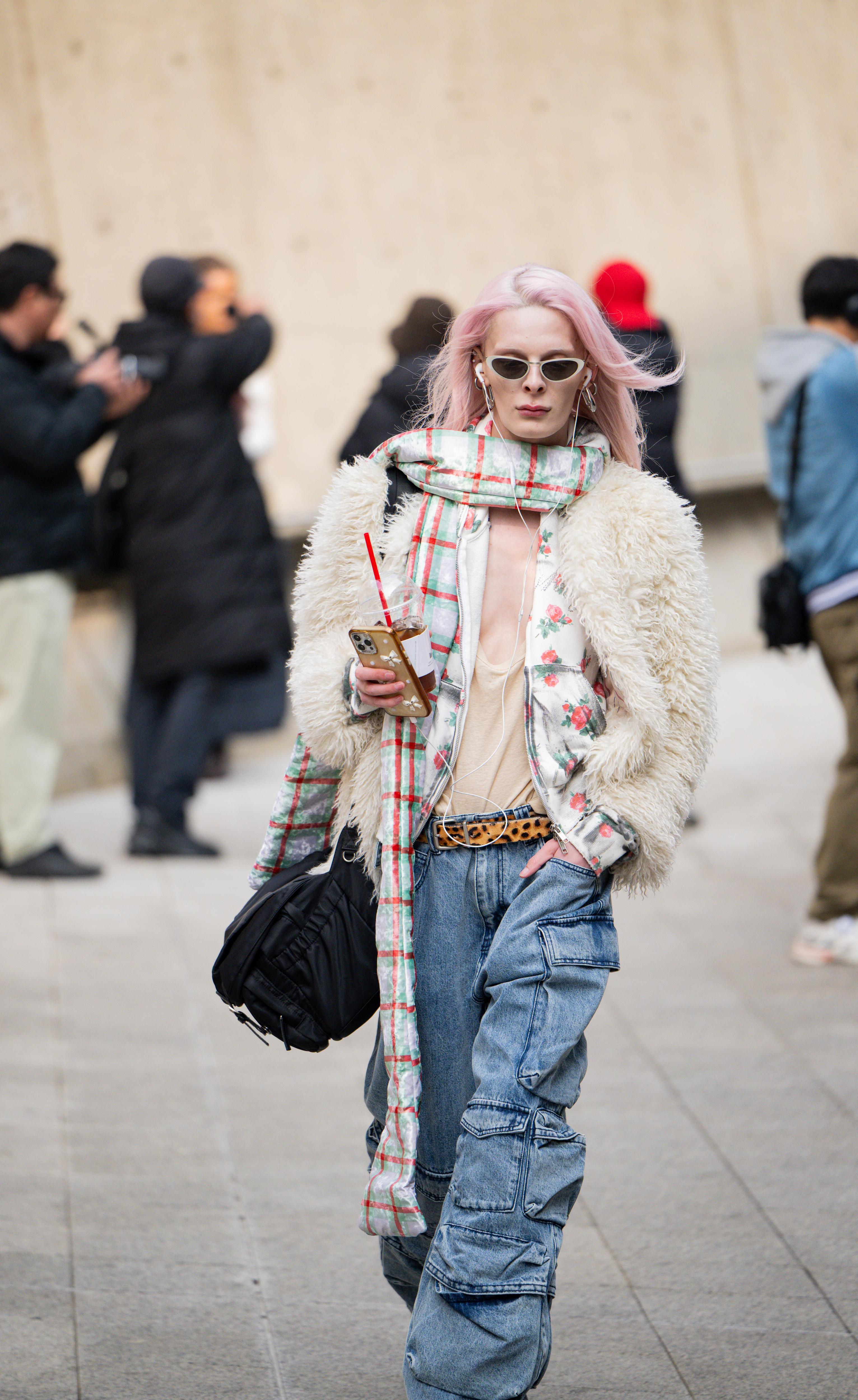 Апофеозом сеульского стритстайла стал отвязный максимализм. Здесь не просто соединяют несочетаемое — здесь это возводят в абсолют. Клетчатый шарф, цветочная толстовка, леопардовый ремень, объемная шуба, джинсы с накладными карманами и розовые волосы в одном образе? Да! Именно так.