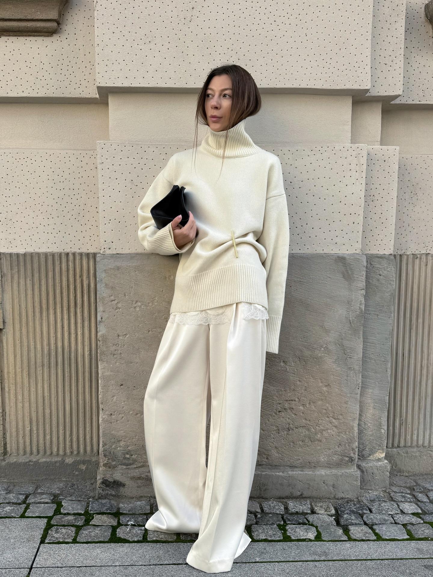 Пятый прием адресован тем, кто любит минимализм, но иногда страдает от ощущения, что образу не хватает яркости. Решение есть: надевай максимально крупные украшения. Например, это могут быть массивные серьги, которые станут главным акцентом у лица, или браслеты, которые стоит натянуть прямо поверх рукавов свитера или жакета, придав аутфиту текстуры и индивидуальности.