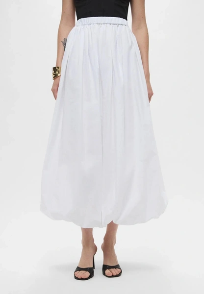 Самый неожиданный и архитектурный вариант из всех. Юбка-баллон отличается характерным объемом: она пышная, но при этом собранная по низу на резинку или манжету, благодаря чему напоминает воздушный шар. В длинном варианте такая модель выглядит особенно эффектно — она создает драматичный силуэт, но за счет белого цвета и легкой ткани не кажется тяжелой. Носить юбку-баллон лучше всего с максимально простым верхом: облегающей водолазкой, лаконичным топом или корсетом.