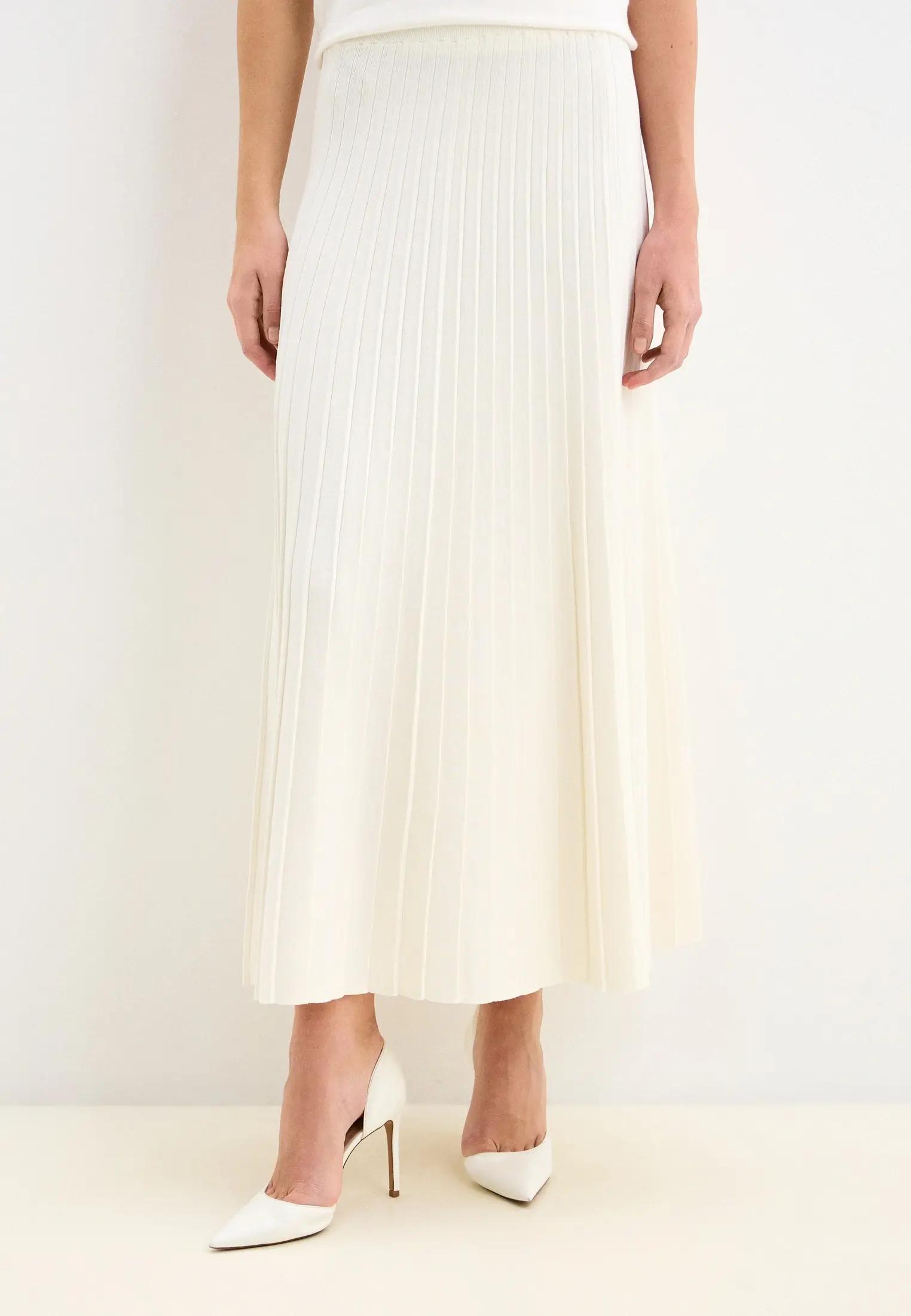 Она такая же белая, как и остальные, но с характером. По длине ее перехватывают слабые резинки, создавая мягкие ярусы, которые придают юбке объем и текстуру. Это вариант для тех, кто любит расслабленный, почти деревенский шик. Носи ее с высокими сапогами, казаками или сандалиями на плоской подошве, а сверху надевай объемную блузку, свитер-паутинку или льняную рубашку — получится невероятно удобно, уютно, но при этом очень стильно!