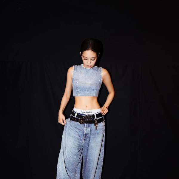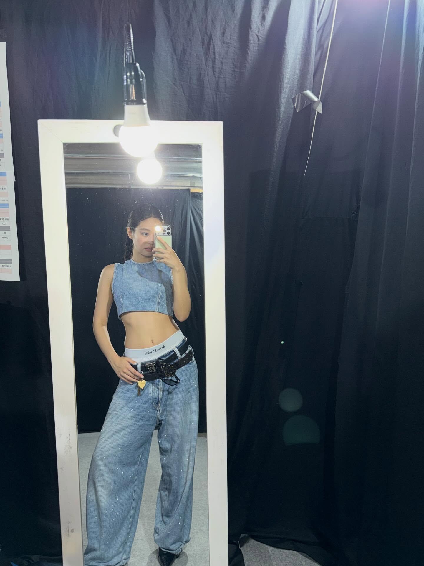 В этот раз Дженни появилась в неожиданной вариации канадского смокинга — того самого союза денима с денимом, который многие считают слишком смелым. На ней был укороченный топ без рукавов и широкие синие джинсы с мерцающими кристаллами. Но даже при всей яркости отделки главным элементом стали вовсе не стразы, а то, что происходило в области талии.