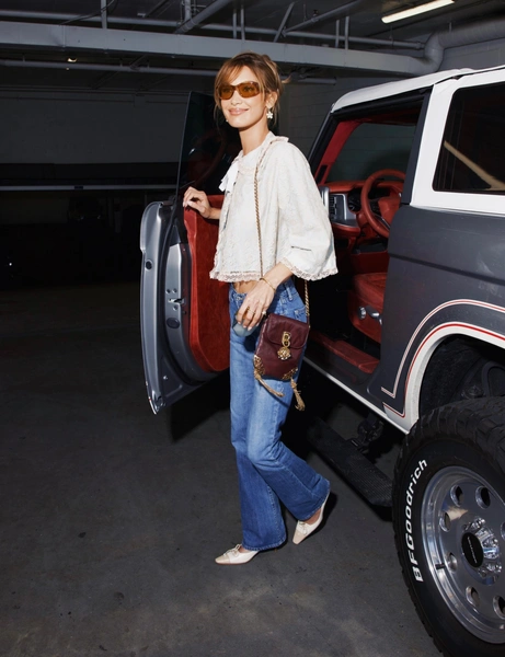 Низ модель решила оставить предельно простым, и в этом кроется главная стилистическая фишка. Классические синие джинсы с легким клешем и низкой посадкой — та самая база, которая есть в гардеробе у многих. Именно они уравновешивают романтичность и почти театральную утонченность кружевного верха, возвращая образу повседневное звучание. Джинсы с заниженной талией, которые еще пару сезонов назад казались пережитком нулевых, снова в моде, и Белла показывает, как носить их без налета ностальгии.