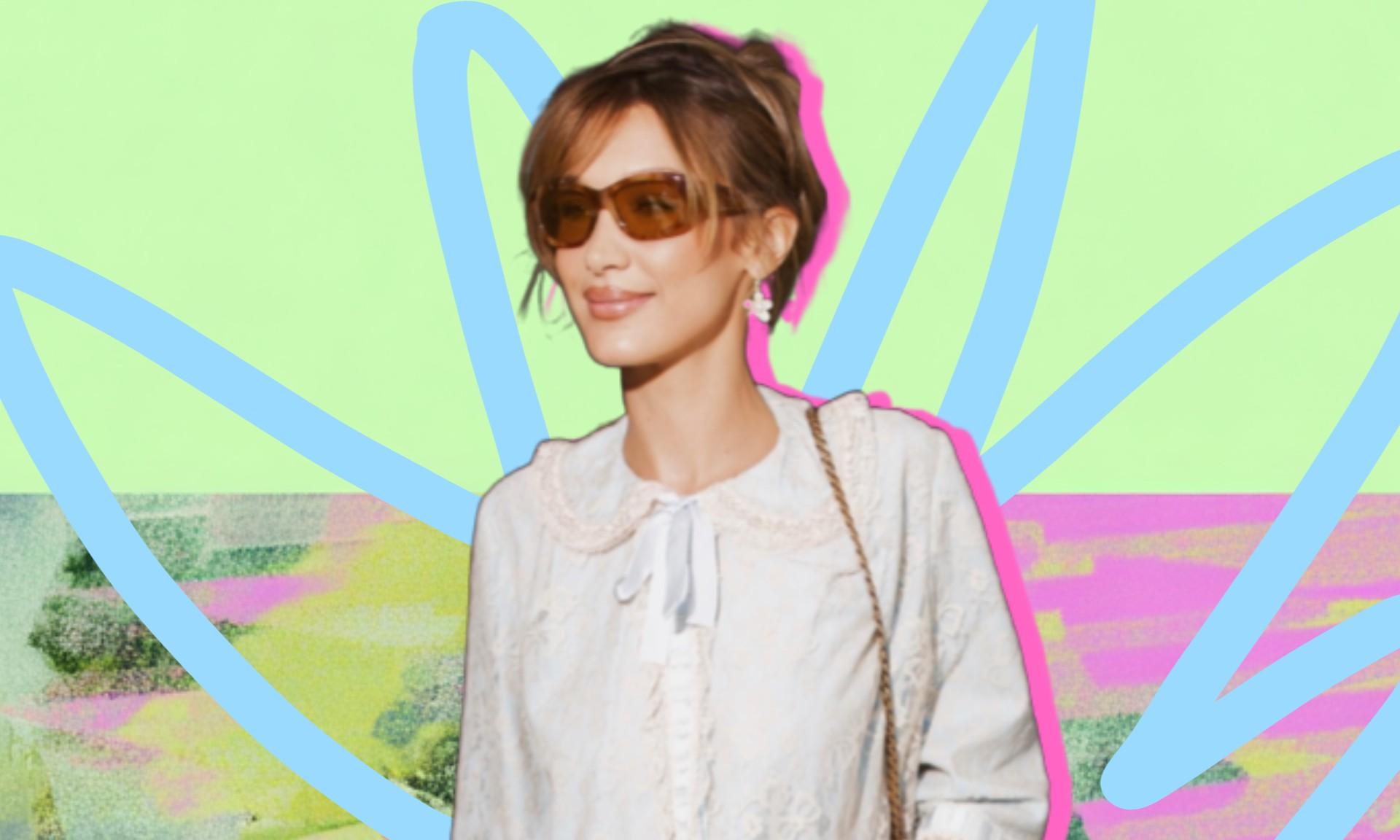 Отдельного внимания заслуживают бьюти-детали: волосы Белла собрала в небрежную высокую прическу с челкой, уложенной набок, и выпущенными прядями у лица — будто их только что растрепал теплый весенний ветер. Макияж остался в той же гамме: ровный тон и нюдовые глянцевые губы.