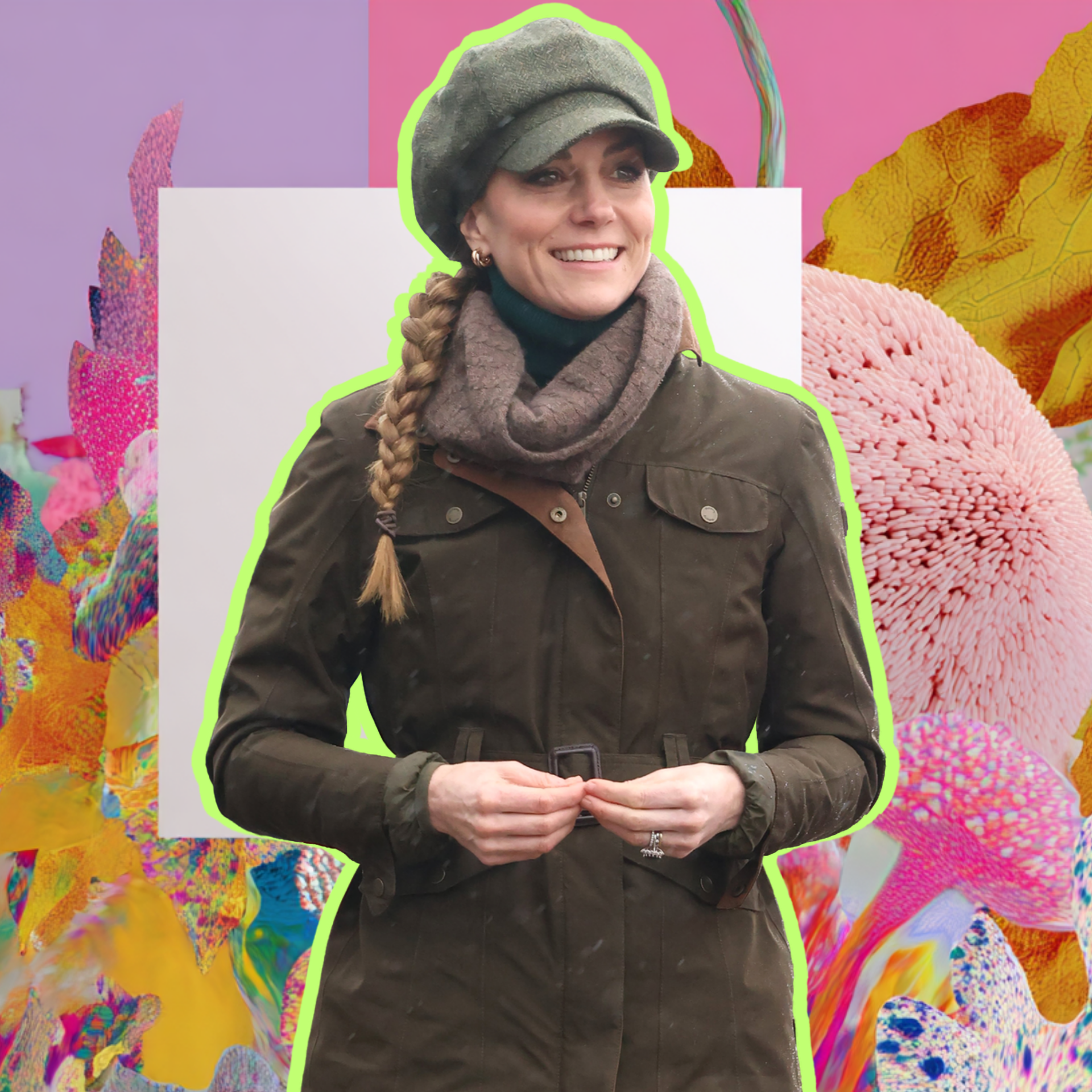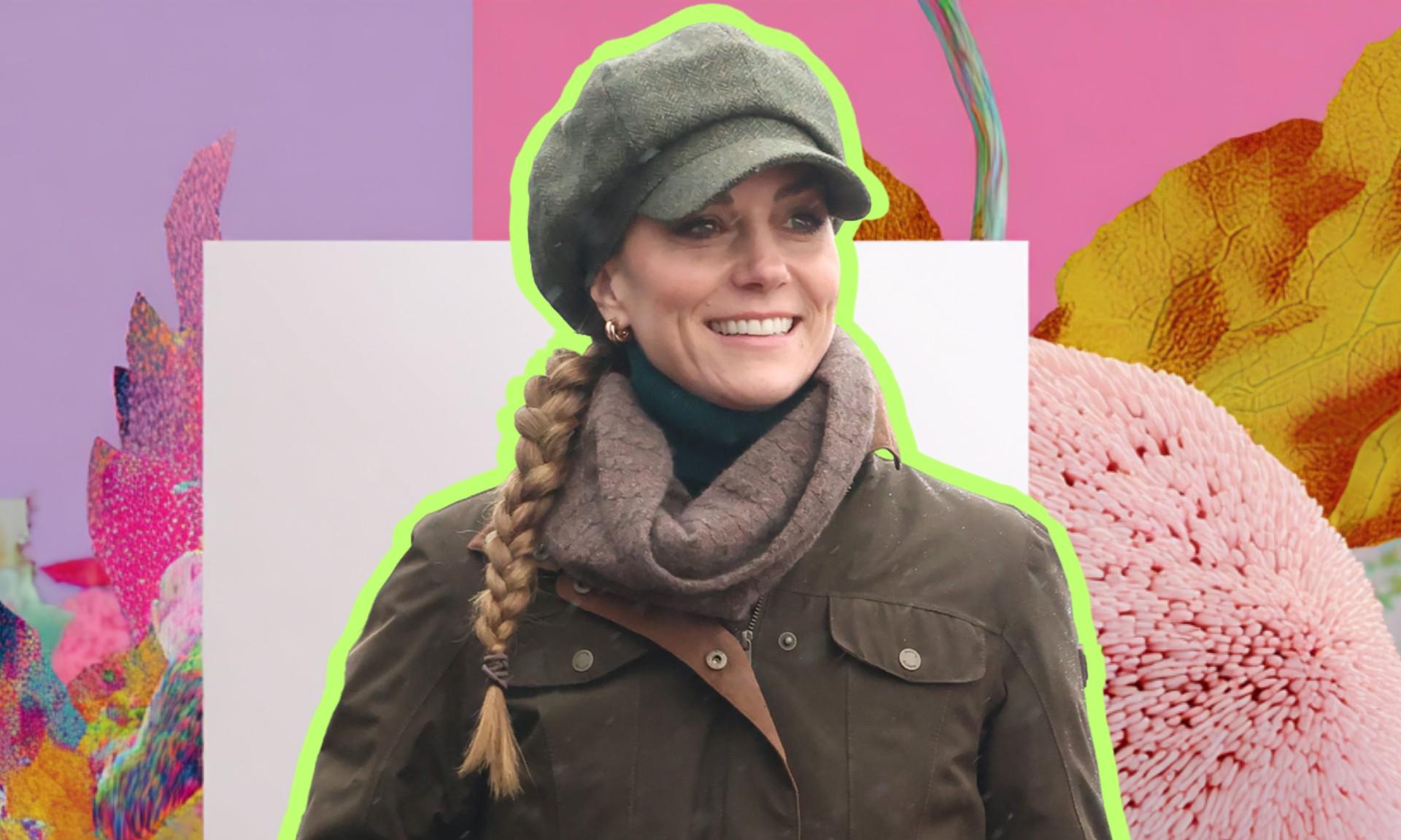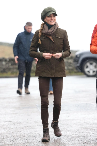 Для прогулки Кейт выбрала продуманный и очень показательный образ для активного отдыха. Никакой показной модности — только выверенные силуэты, спокойные оттенки и вещи, которые действительно работают. Оливково-зеленый жакет в стиле милитари с поясом на талии был надет поверх водолазки с плотным высоким воротом глубокого хвойного цвета. Шею она дополнительно укутала шерстяным коричневым шарфом, а голову защитила кепку-восьмиклинку оттенка мха, из-под которой выглядывала аккуратно заплетенная длинная косичка.