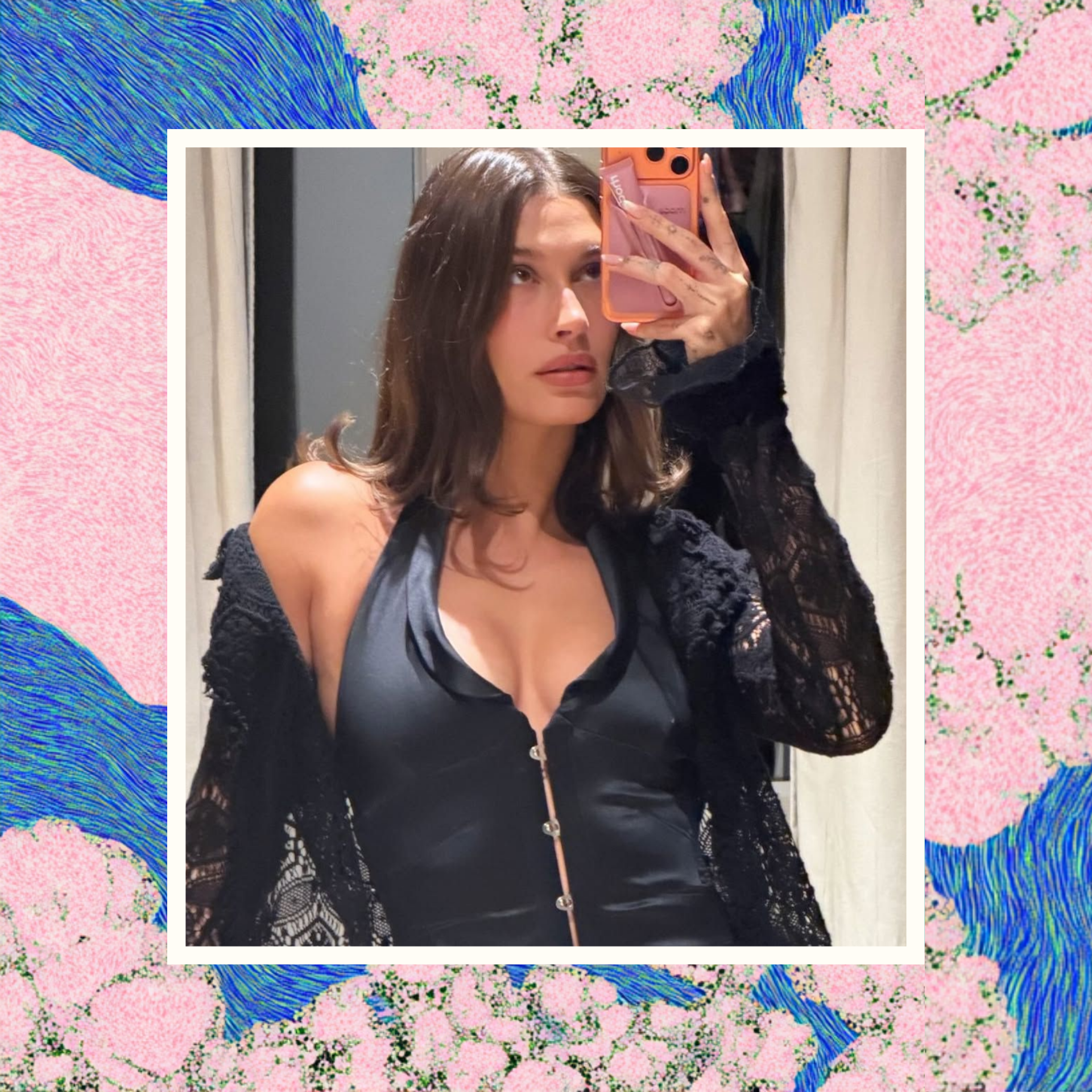 В основе лука — лаконичная юбка-карандаш из гладкой, почти текучей ткани. Она мягко облегает фигуру, не сковывая движений, и задает четкую вертикаль. К ней Хейли подобрала корсетный топ с воротником-халтером — один из самых заметных трендов сезона. Такой верх открывает плечи и ключицы, добавляя образу изящества и делая его визуально легче. Это важный момент: в теплое время года черный цвет требует именно такого подхода, и открытые зоны здесь работают как разгрузка.