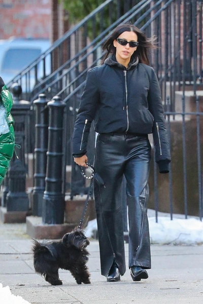 И конечно, не могу не отметить пристрастие модели подбирать к каждому луку еще и подходящий поводок для выгула Арахиса. То это бирюзовый, как на пляже в Майами, то вот такой — черный с металлическими клепками, дерзкий, под стать ее образу с байкерскими брюками и молниями. Мелочь? Возможно. Но именно из таких мелочей и складывается настоящий стиль 🤩