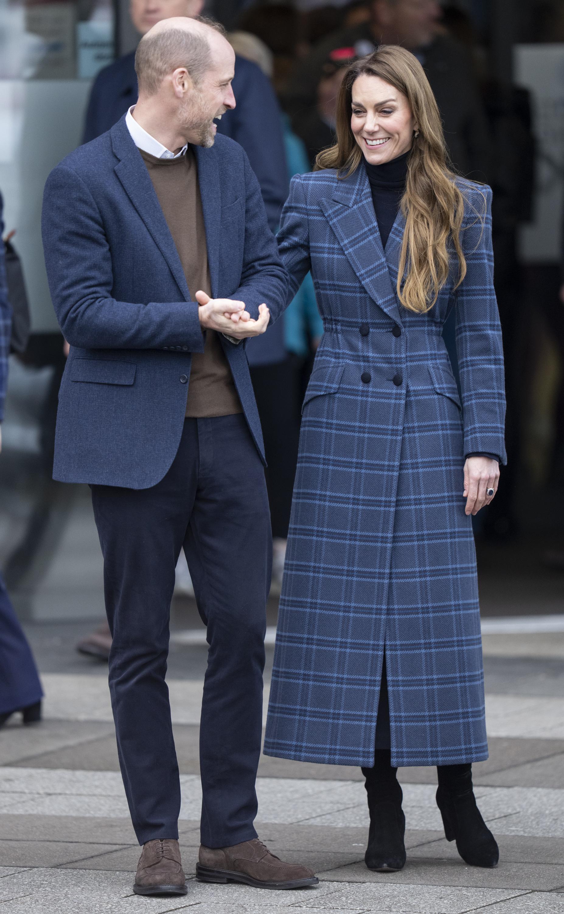 Принц Уильям поддержал цветовую логику образа супруги. Он появился в серо-синем блейзере, коричневом джемпере и черных брюках, дополнив комплект белой рубашкой и замшевыми коричневыми туфлями. Вместе их образы выглядели сдержанно и гармонично — именно так, как и предполагает формат официального визита.