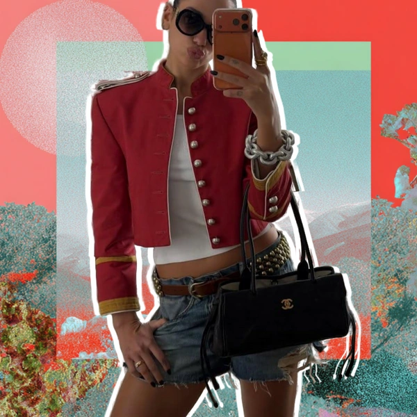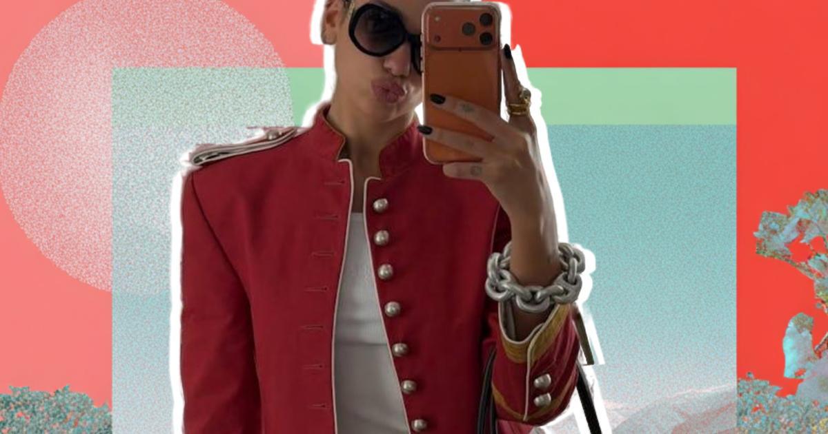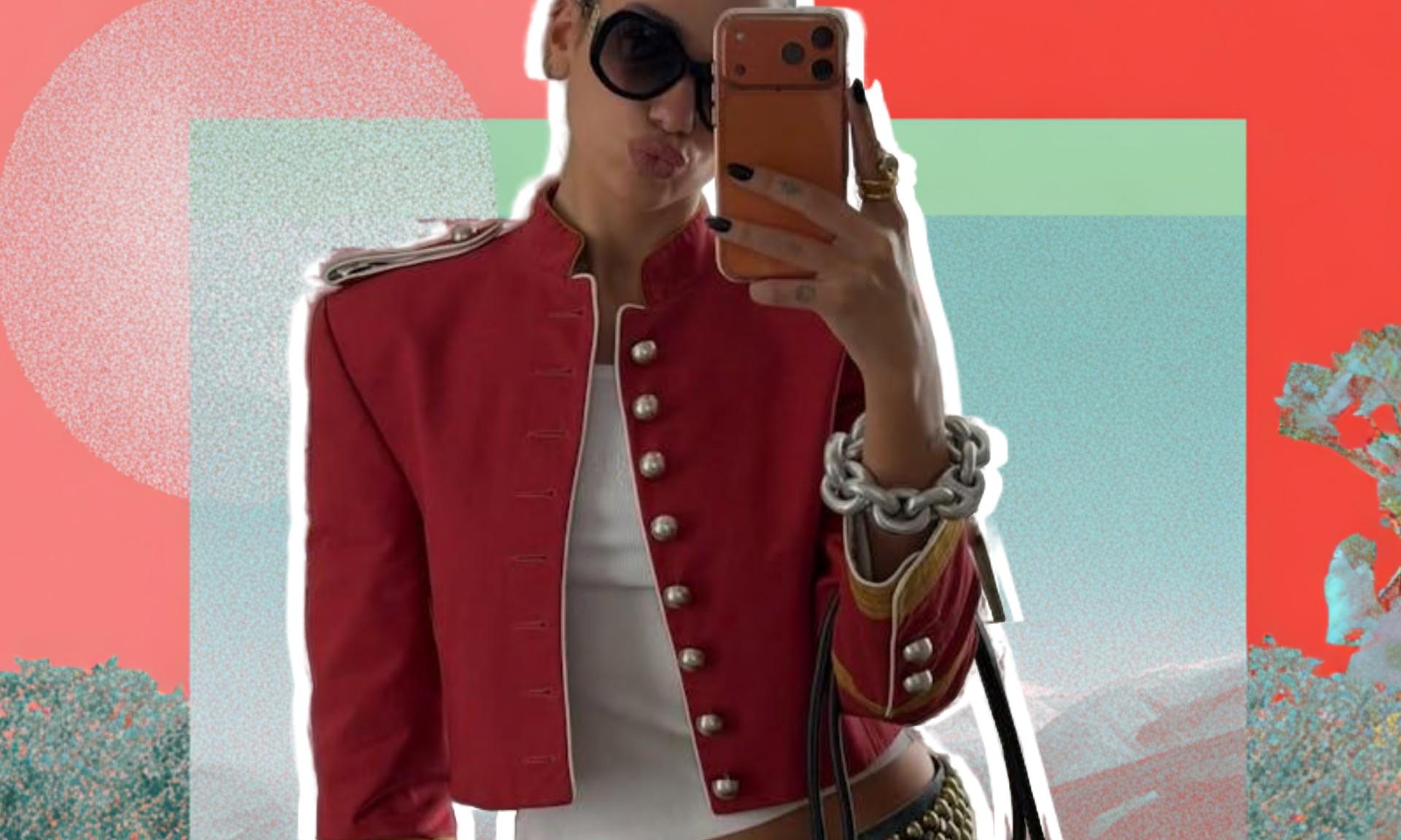 Основой образа стал красный укороченный жакет-доломан из коллекции Ann Demeulemeester весна-лето 2026, представленной на Неделе моды в Париже. Модель имела крупные металлические пуговицы, эполеты и желтую контрастную окантовку на манжетах, которая подчеркивала воинственный характер вещи, но при этом не делала образ агрессивным. Жакет отсылает к эпохе Indie Sleaze, когда куртки в стиле милитари были обязательной частью гардероба модников, и одновременно работает в современном контексте: лаконичные линии и точная посадка создают актуальный силуэт.