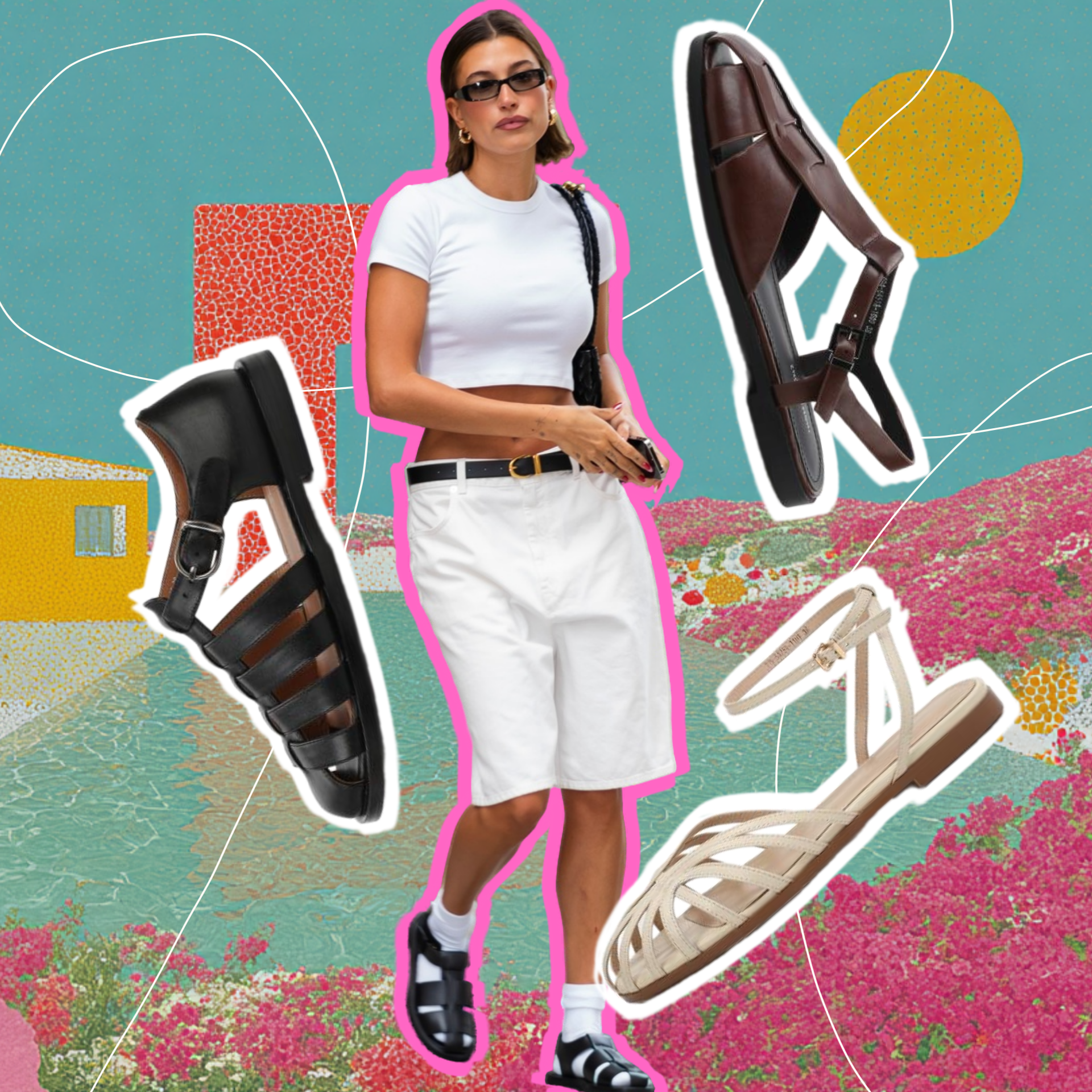Для тех, кто предпочитает более мягкие линии и сдержанный дизайн, подобный тому, что носят Хейли Бибер, Бланка Миро и другие фэшн-инфлюенсеры, беспроигрышным решением станут рыбацкие сандалии из гладкой матовой кожи на тонкой, почти невесомой подошве. Такая версия выглядит гораздо более элегантно и деликатно, легко вписывается в минималистичный гардероб и прекрасно сочетается с прямыми джинсами, льняными брюками, юбками-карандаш, шортами и даже строгими рубашками.