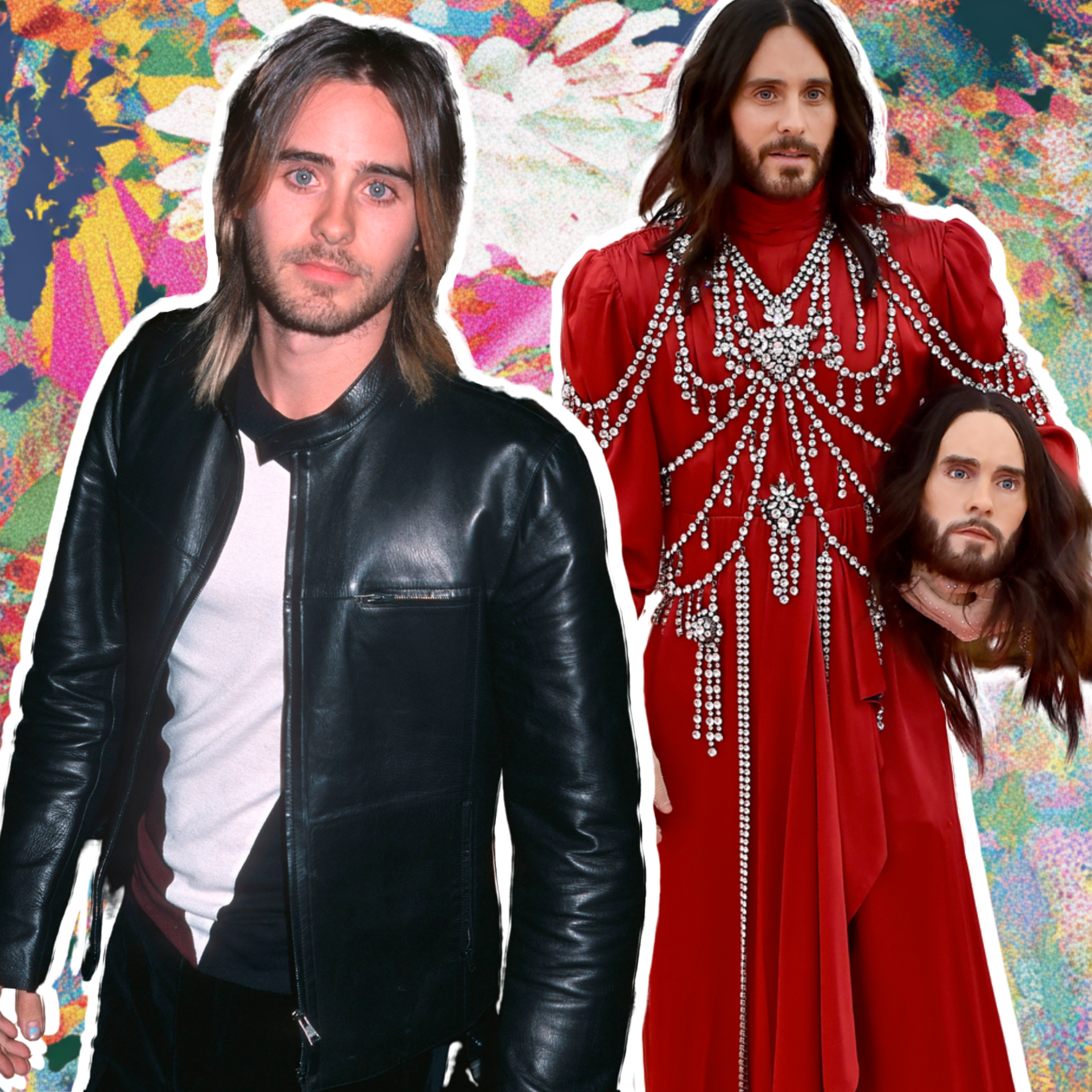 В конце 90-х и начале нулевых Джаред Лето выглядел как герой альтернативной сцены своего времени. Потертые джинсы, спортивки, кожаные куртки, майки, длинные волосы, вызывающий макияж глаз и накрашенные ногти — все это считывалось как хулиганское продолжение его музыкального проекта Thirty Seconds to Mars. Это был слегка провокационный, чуть растрепанный рок-н-ролльный стиль, выстроенный без помощи стилистов и сложных концепций.