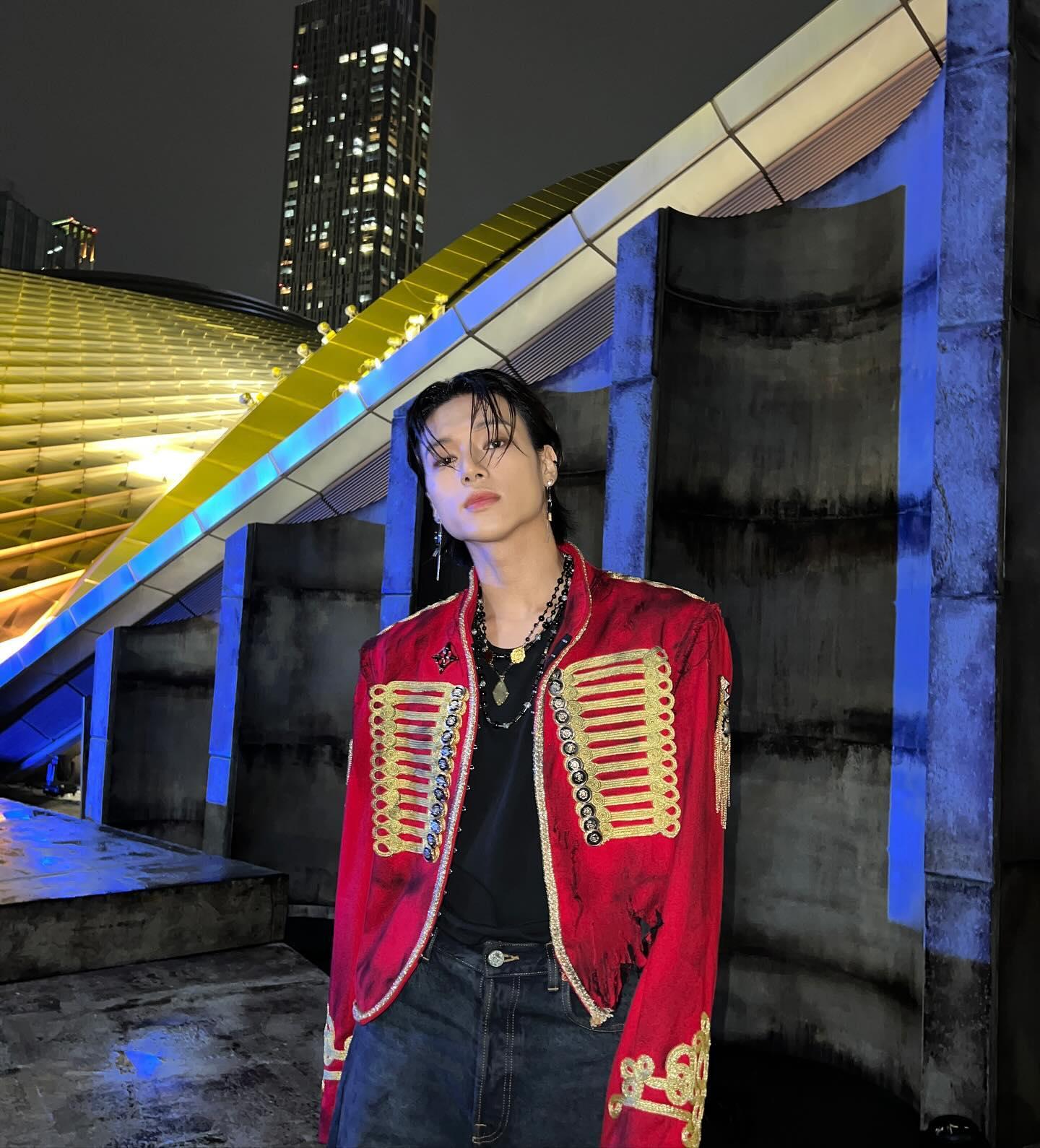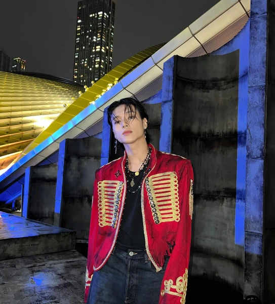 После 2022 года стилистика ATEEZ стала еще более дерзкой. Яркие вставки, блестящие куртки, асимметрия, крупные аксессуары — все это идеально подходило Уёну, который уже уверенно справлялся с самым сложным сценическим костюмом.