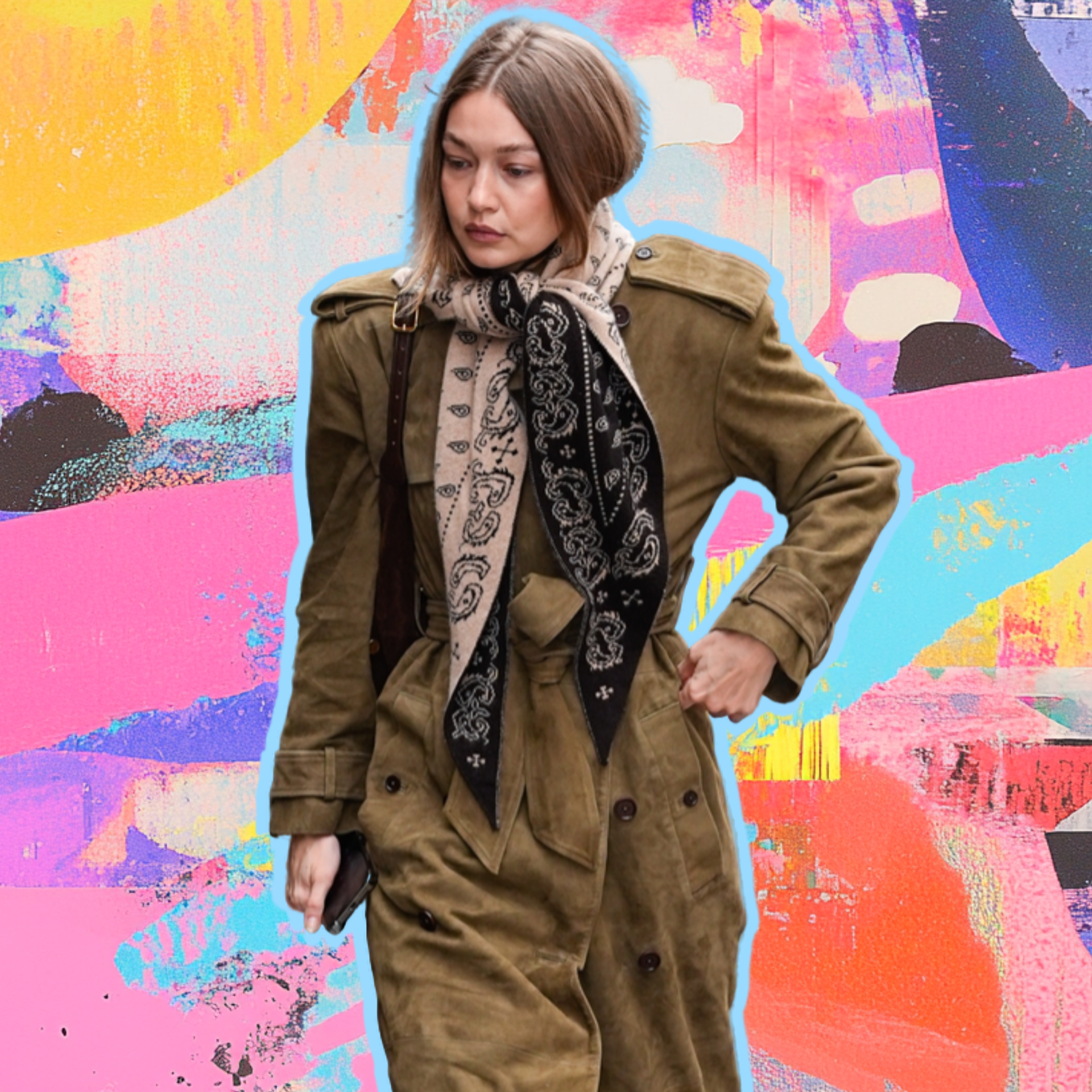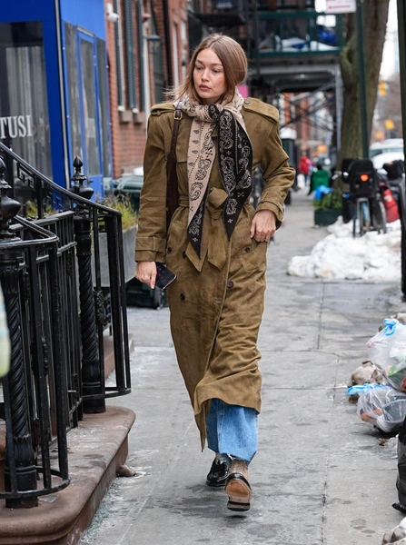 Второй ключевой аксессуар Джиджи расположился у ее шеи. Это кашемировый шарф от ее собственного бренда Guest in Residence с жаккардовым узором, напоминающим павлиньи перья. Оттенки жженого какао и песочно-бежевого идеально вписались в общую приглушенную гамму образа. Джиджи завязала платок узлом прямо под подбородком, а заодно заправила под него волосы — тот самый характерный прием сестер Олсен, который моментально превращает обычный образ в элегантный лук с налетом богемной небрежности.