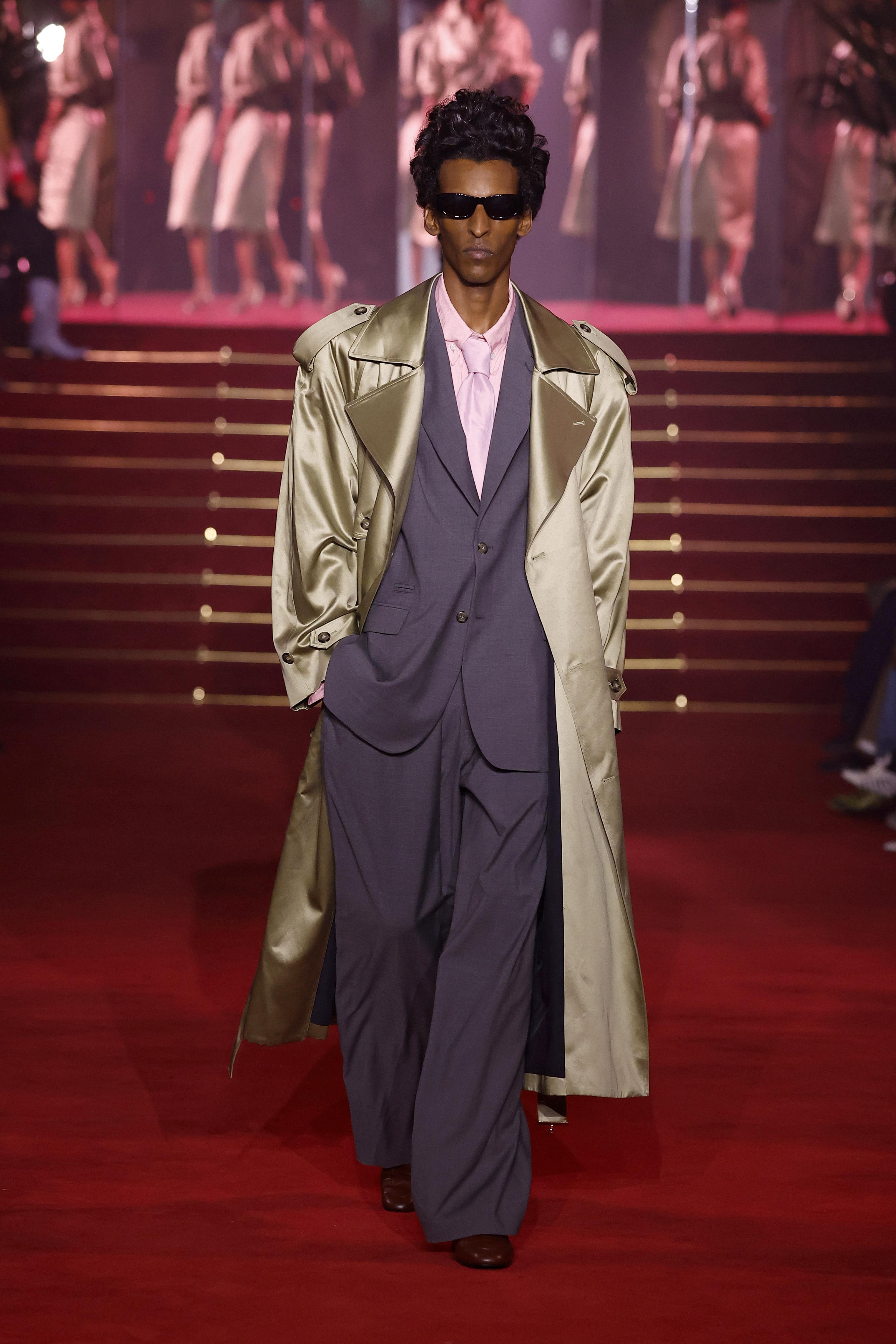 Классический тренч снова в центре внимания. Хлопковый или атласный, в паре с серым или синим костюмом, галстуком и темными очками — у Willy Chavarria, Doublet и Dunhill получился почти учебник по современной элегантности.
