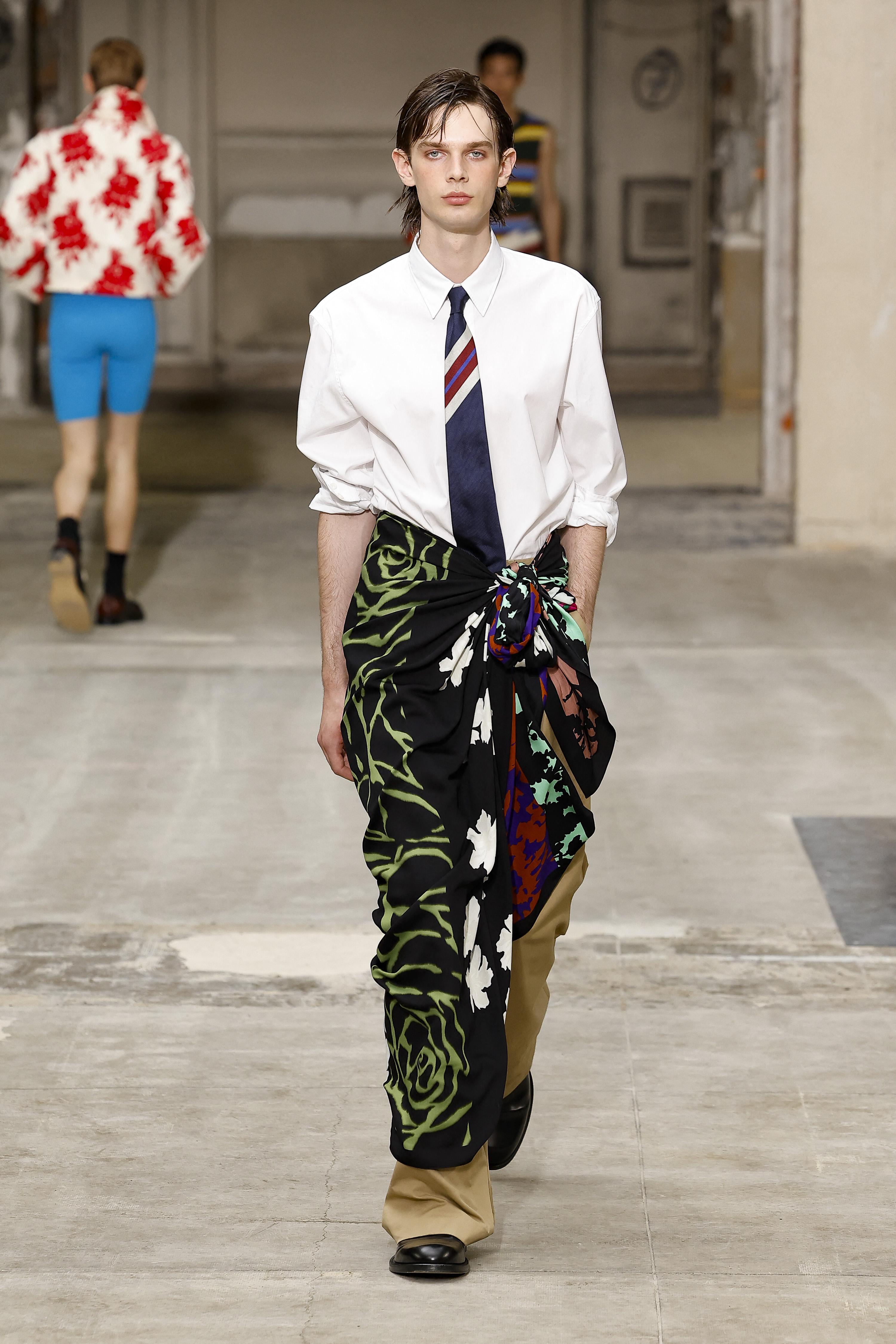 Крупным платкам дизайнеры тоже нашли новое применение — теперь их следует носить как набедренные повязки. Dries Van Noten предлагает легкие шелковые модели, которые красиво реагируют на малейшее движения, а у Junya Watanabe — плотный деним с намеком на юбку. Мужская мода здесь явно заигрывает с вызывающими формами, но делает это осторожно и очень продуманно.