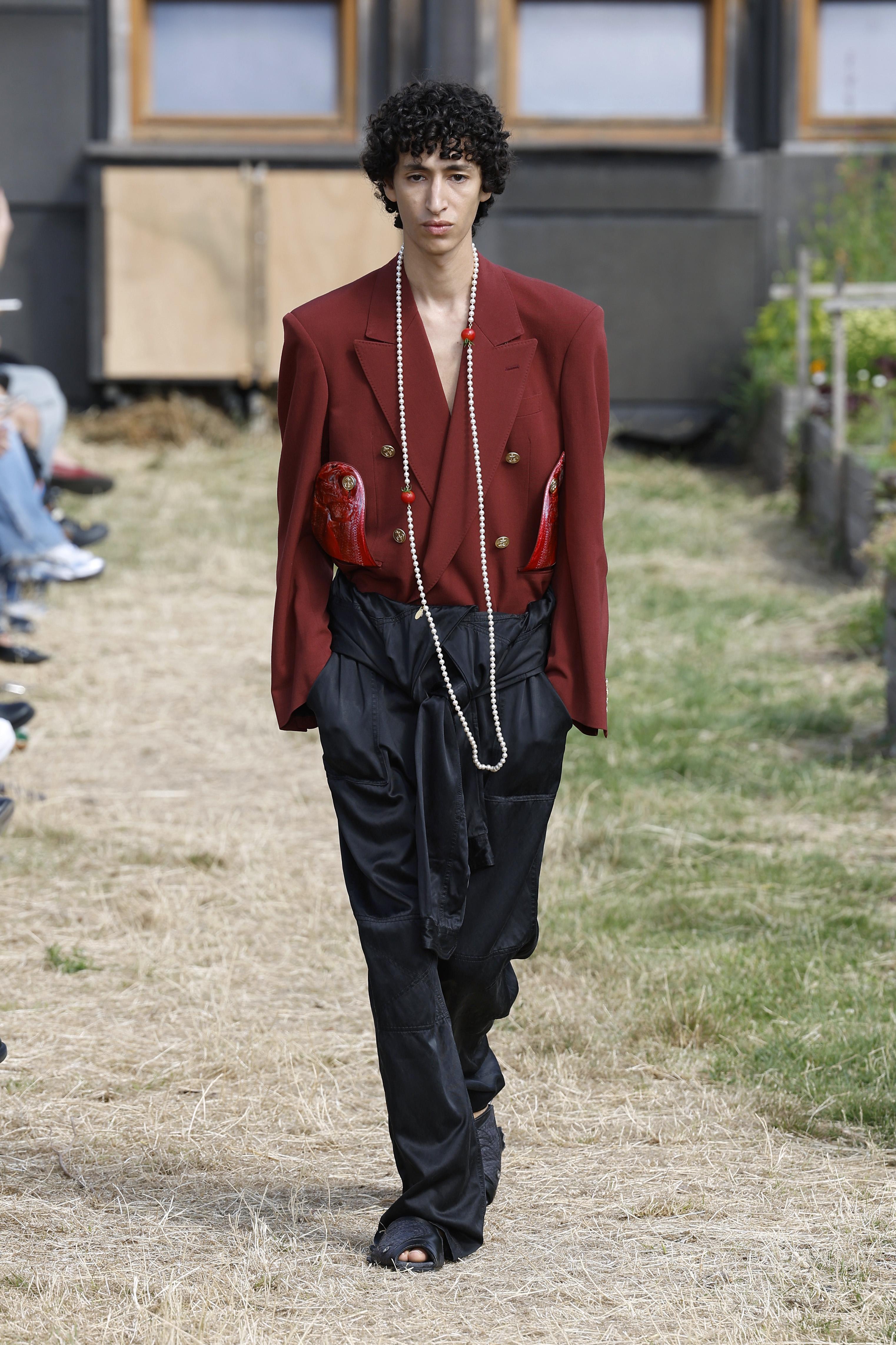 Если лимонный кажется слишком смелым, в мужских коллекциях найдется более сдержанная альтернатива — приглушенный бордовый. После желтого это, пожалуй, главный цвет сезона. В Prada его вписывают в интеллигентные образы с бежевыми брюками и приталенными джемперами. Dries Van Noten, Dolce & Gabbana и Saint Laurent идут дальше и предлагают вишневые монохромные комплекты.