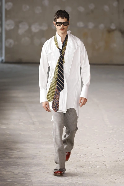 Идеальный узел больше не обязателен. В сезоне весна-лето 2026 галстук можно носить как угодно, лишь бы не слишком правильно. Dior предлагает разворачивать его изнанкой наружу, Saint Laurent прячет кончик под сорочку, а Junya Watanabe вообще надевает сразу несколько полуразвязанных галстуков. Смысл один: этот строгий аксессуар больше не символизирует дисциплину