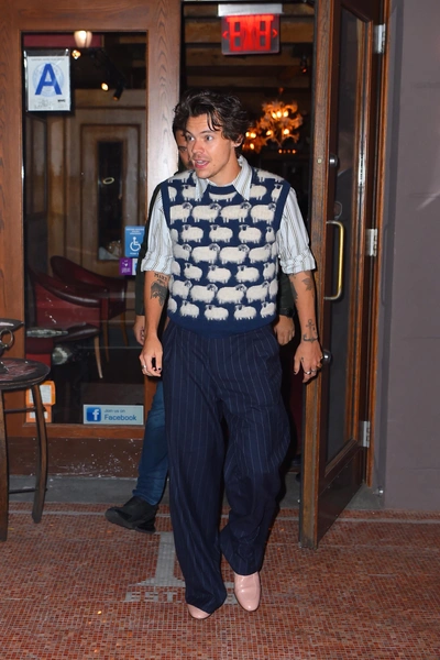 Выходя из нью-йоркского ресторана в 2019 году, Гарри Стайлз был одет в вязаный жилет Rowing Blazers, напоминающий известный свитер принцессы Дианы