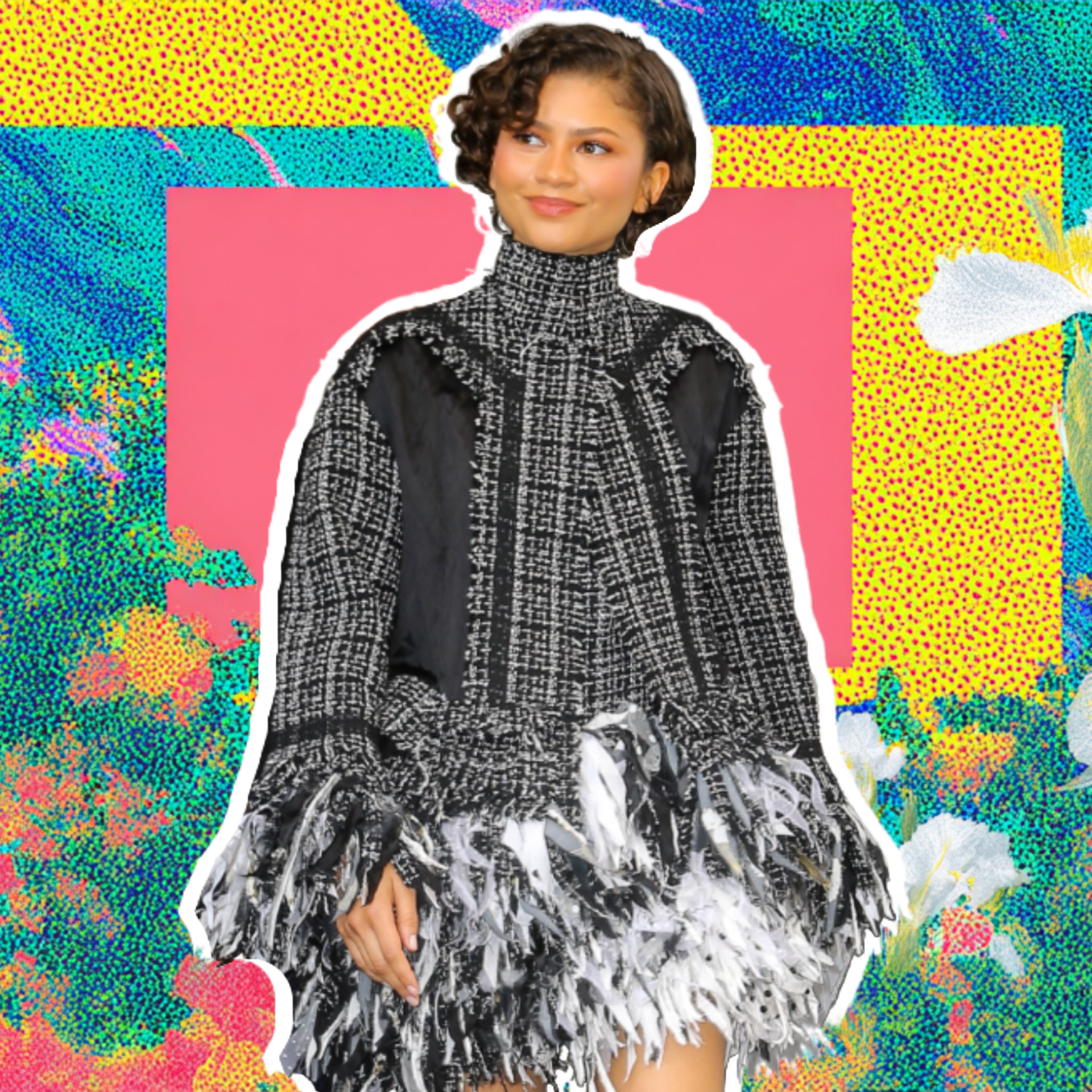 Под жакетом скрывалось платье с многослойной юбкой мини, украшенной рваной тканой бахромой, которая повторяла черно-белую цветовую палитру верха. Манжеты рукавов пиджака получили такую же отделку — бахрома словно перетекала с юбки на жакет, объединяя два элемента в один динамичный силуэт. Зендея дополнила образ минимумом украшений и туфлями с острым носком — разумеется, белого цвета, чтобы поддержать общую гамму. Акцент сместился с нежности на текстуру, движение и объем.