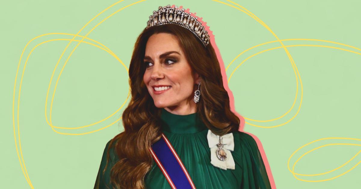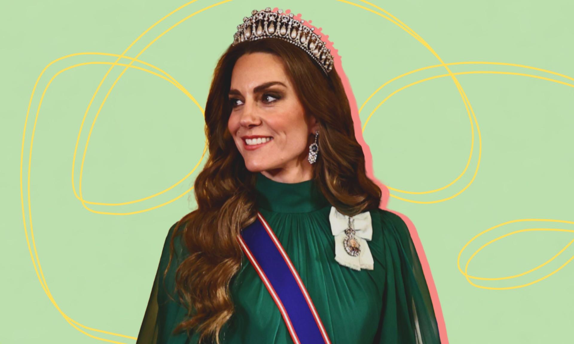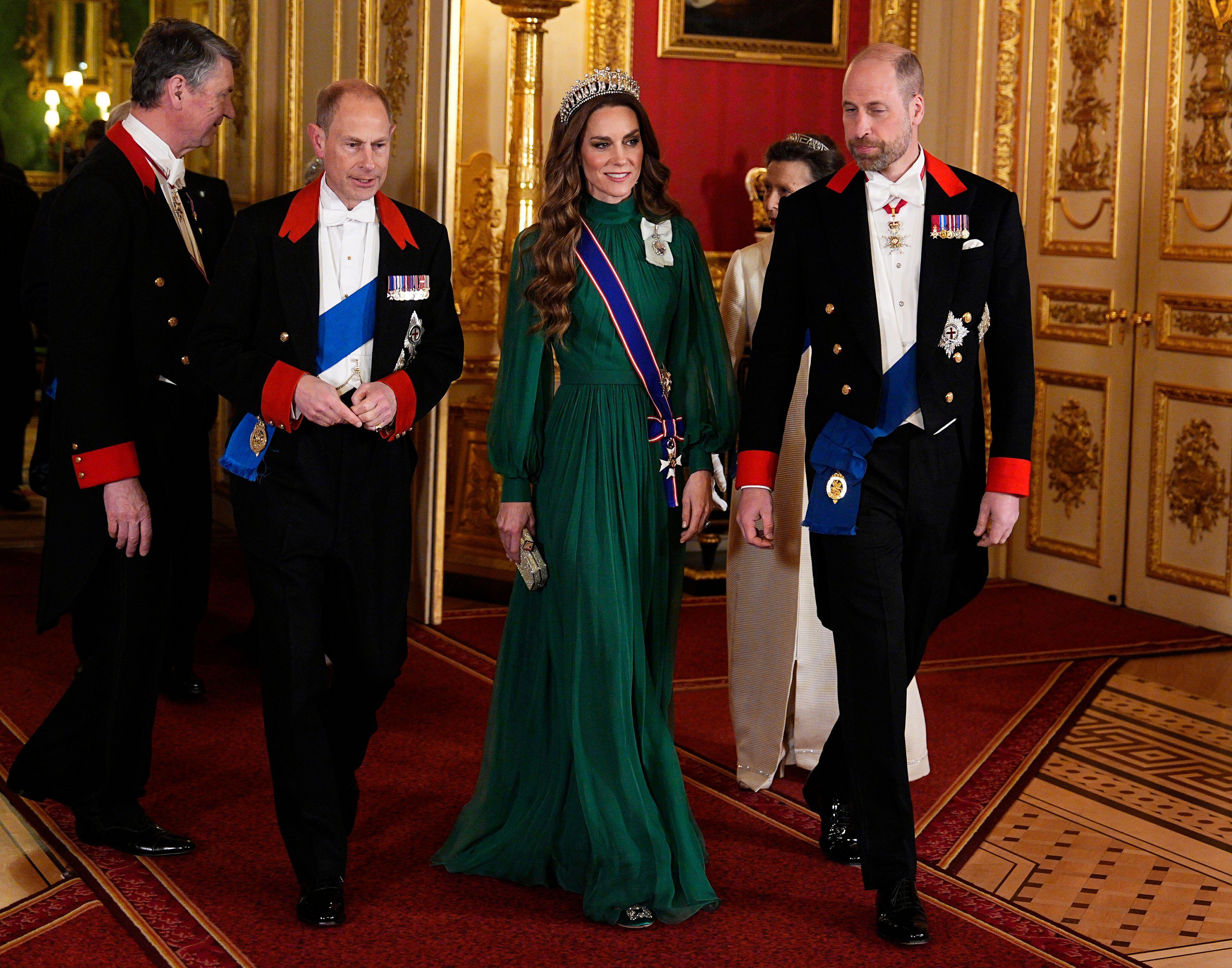 На ней было изумрудно-зеленое платье — глубокий и насыщенный оттенок на свету то и дело переливался то благородным нефритом, то темным мхом. Фасон принцесса выбрала безупречный: высокий воротник, плотно облегающий шею, воздушные рукава-буфы, которые добавляют образу легкости и отсылают к викторианской эстетике, и встроенный пояс, идеально подчеркивающий талию. К слову, зеленый цвет в последнее время явно становится для Кейт знаковым: совсем недавно она появлялась в монохромном образе того же оттенка во время празднования Дня святого Патрика, но это вечернее платье, конечно, звучит совсем иначе — торжественно и даже чуть драматично.