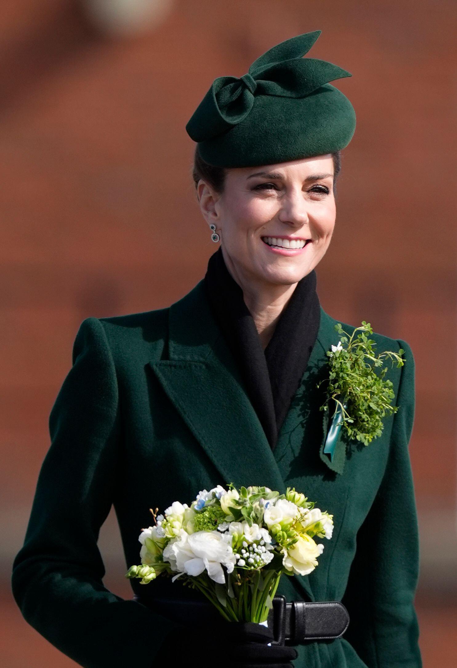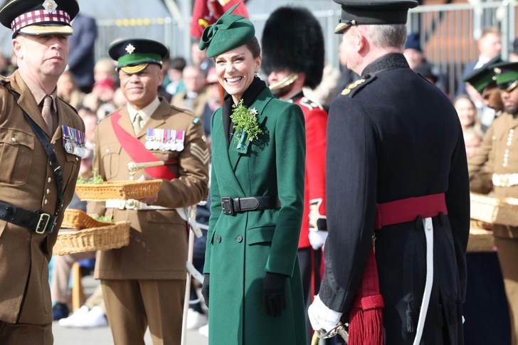 Кейт присутствовала на мероприятии в качестве полковника полка — почетная роль, которую она исполняет уже не первый год. Солдаты гвардии были одеты в коричневую армейскую форму и шляпы цвета лесной зелени, украшенные веточками трилистника — символа праздника, олицетворяющего ирландскую гордость и удачу ☘️